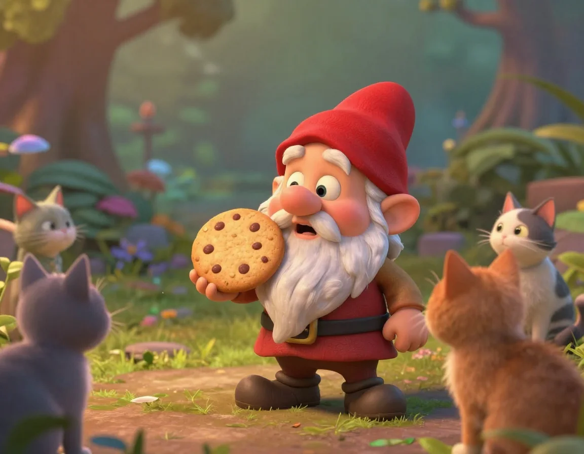 — Вперёд, на выручку нашим разведчикам! — скомандовал я, и мы всей толпой бросились к крыльцу. Когда я включил свой фонарик, мы увидели невероятную картину. Наши коты окружили... старого садового гнома, который ожил и пытался спрятать за спиной целую пачку овсяного печенья! Гном был в красном колпаке, который съехал ему на нос, и в его бороде застряло несколько крошек.