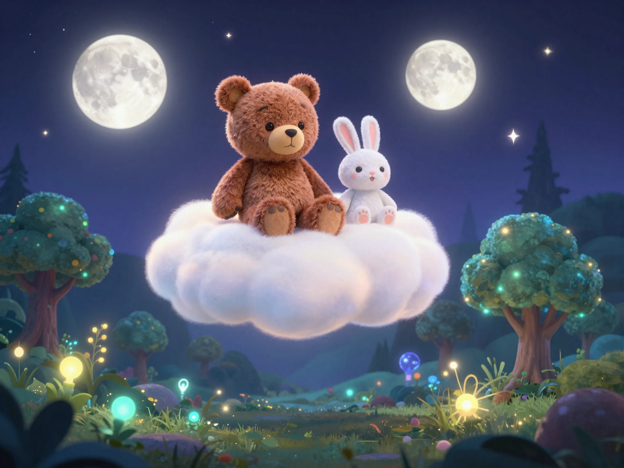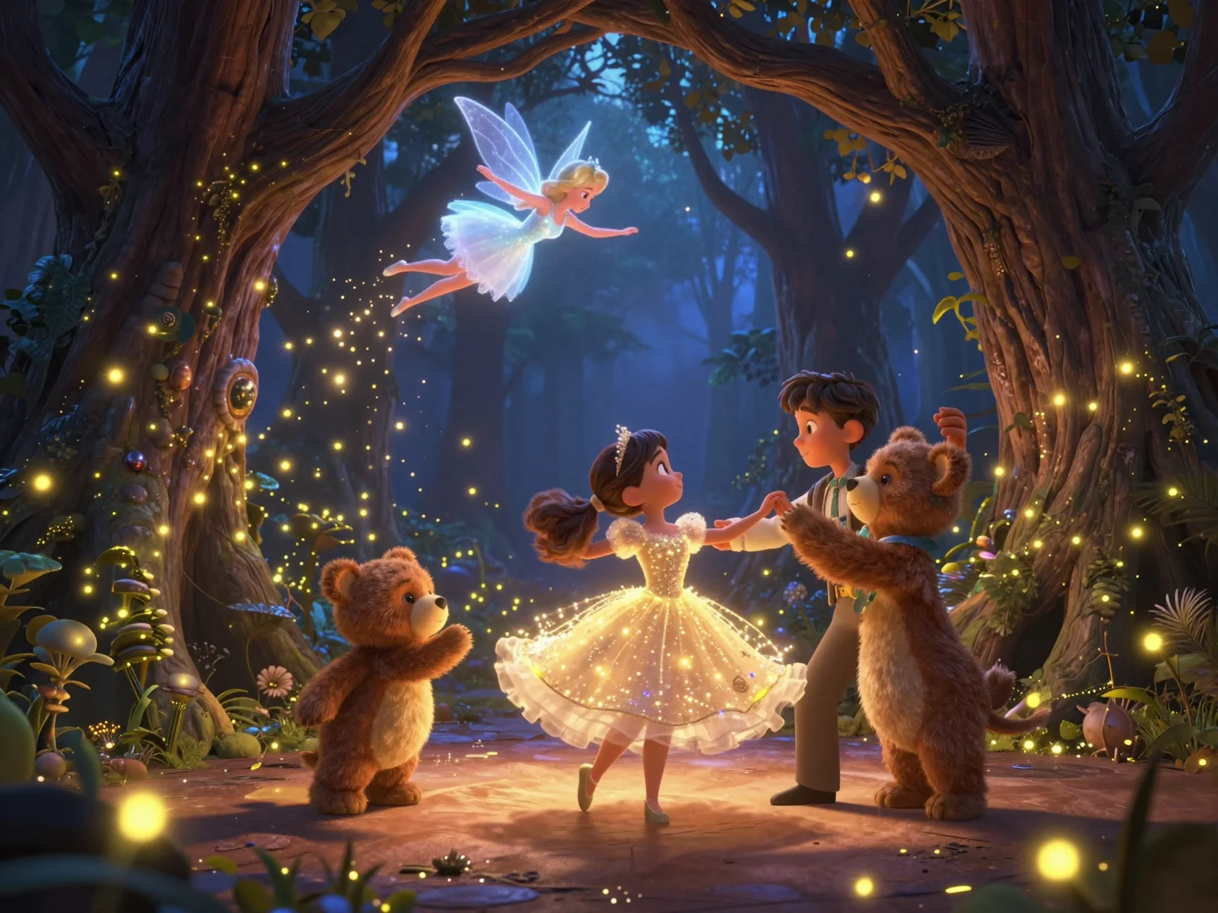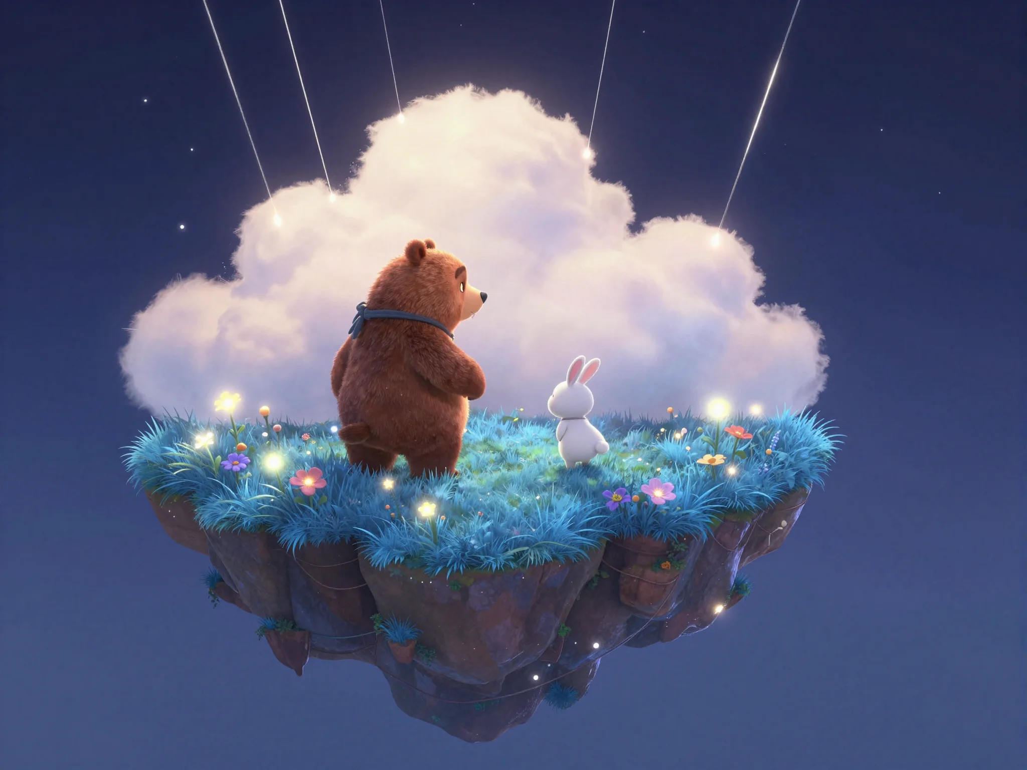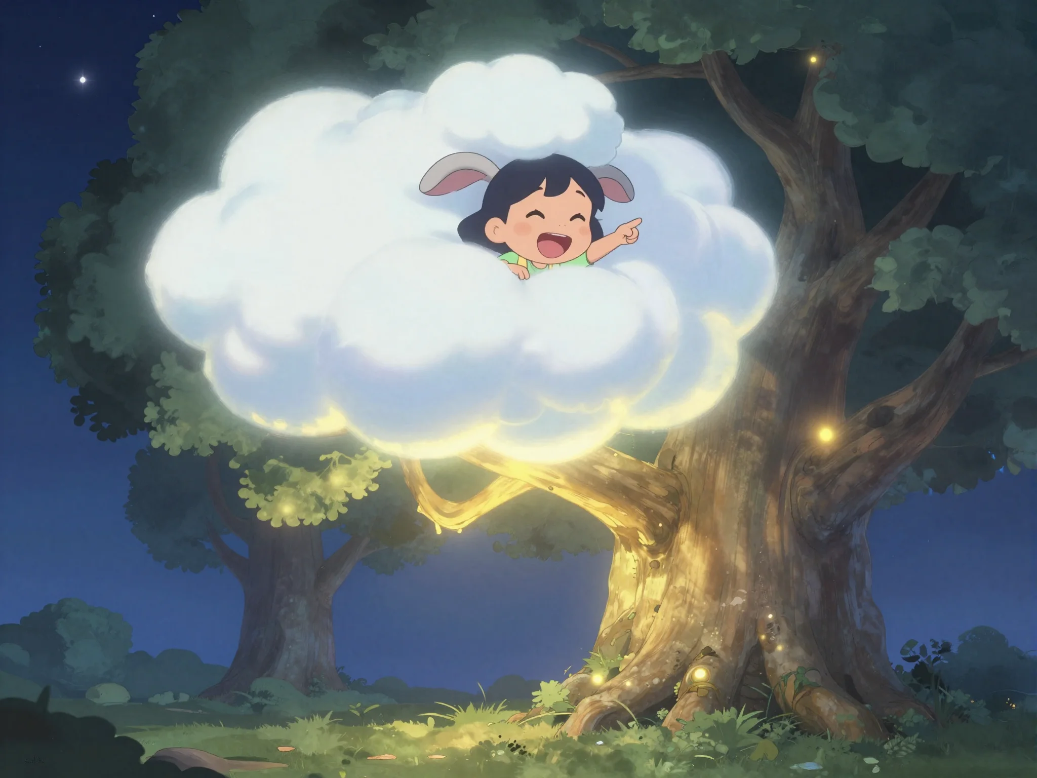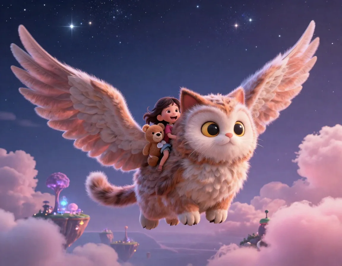 Они вышли на балкон, и вдруг обычный коврик у двери превратился в мягкое облако. Тая, Потап и Зайка уселись поудобнее. Облако плавно оторвалось от земли и понесло их в сторону Большого Дуба, где начинались границы Сонного Заповедника. Вокруг летали светлячки, исполняя тихую мелодию, а звёзды над головой казались огромными сахарными леденцами.