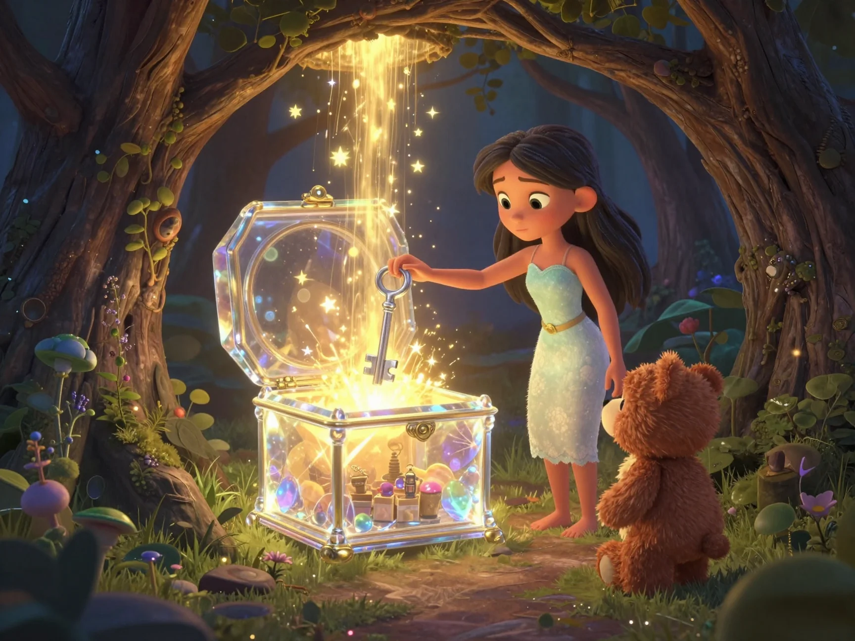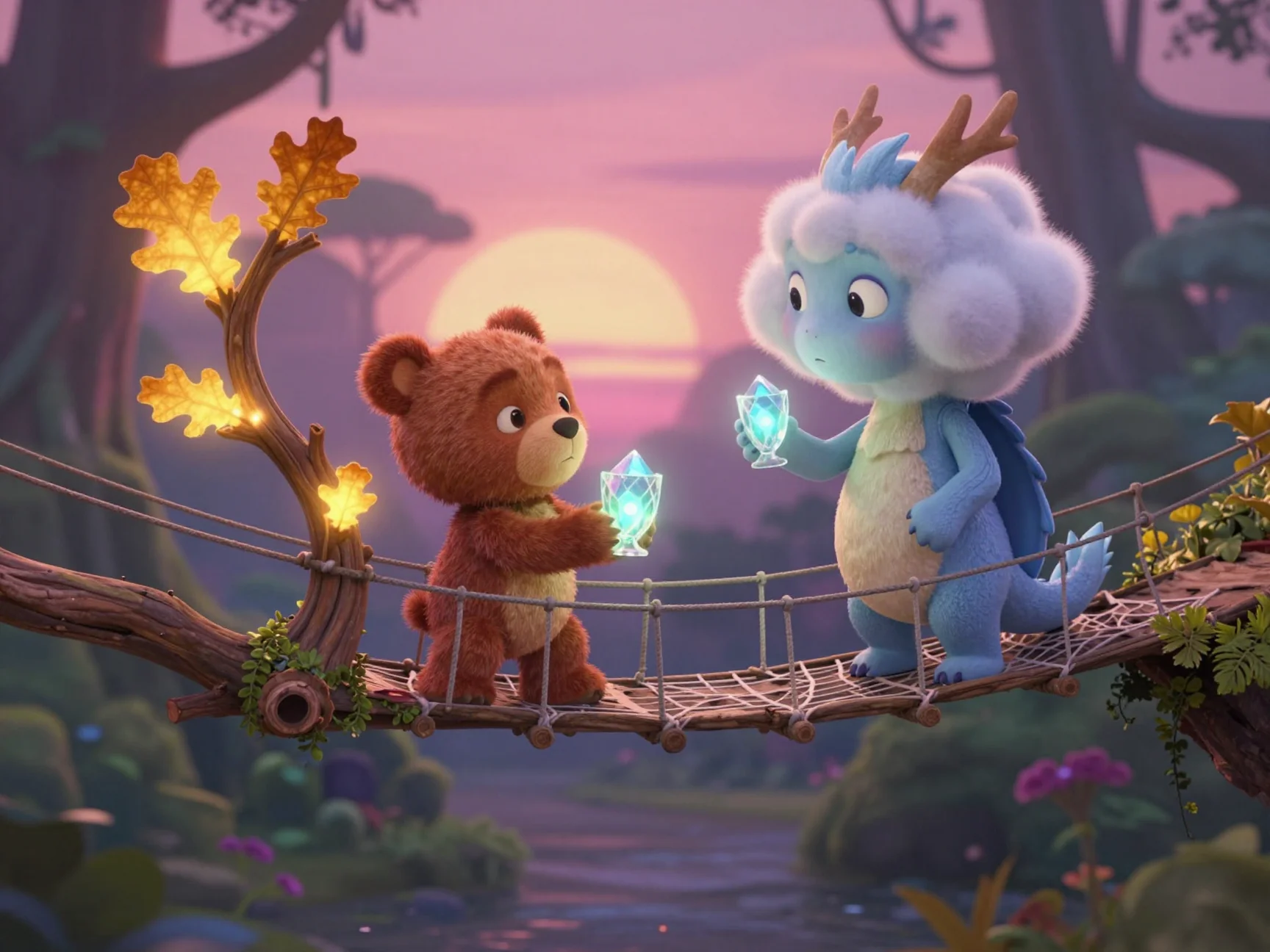 Какое мудрое решение, Тая! Свет Лунной Росы — самый добрый на свете, он разгоняет любые сомнения. Давай посмотрим, как это волшебство поможет нашим друзьям добраться до цели.