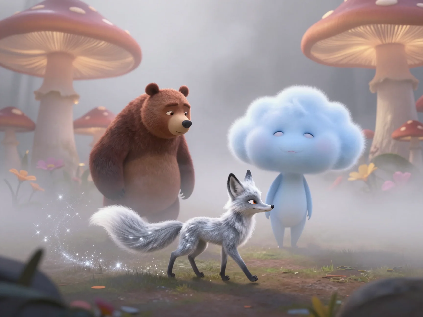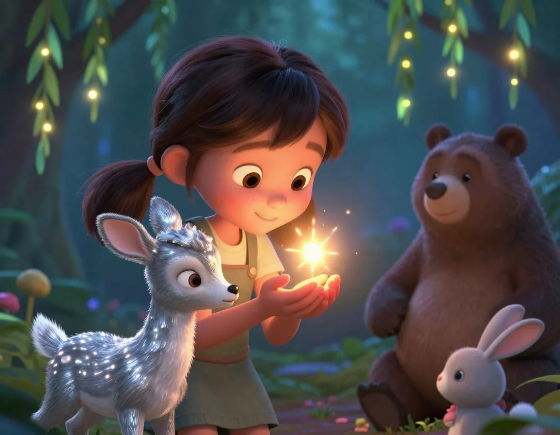 На лепестках цветов, которые только что казались завядшими, начали проступать светящиеся капельки. Они переливались всеми цветами радуги. Лисёнок протянул свою корзинку, и капельки сами начали прыгать в неё, наполняя лес мягким, убаюкивающим сиянием. Друзья почувствовали, как тепло разливается по их телам. Лисёнок больше не дрожал — он чувствовал себя защищённым, потому что рядом была Тая и её верные друзья.