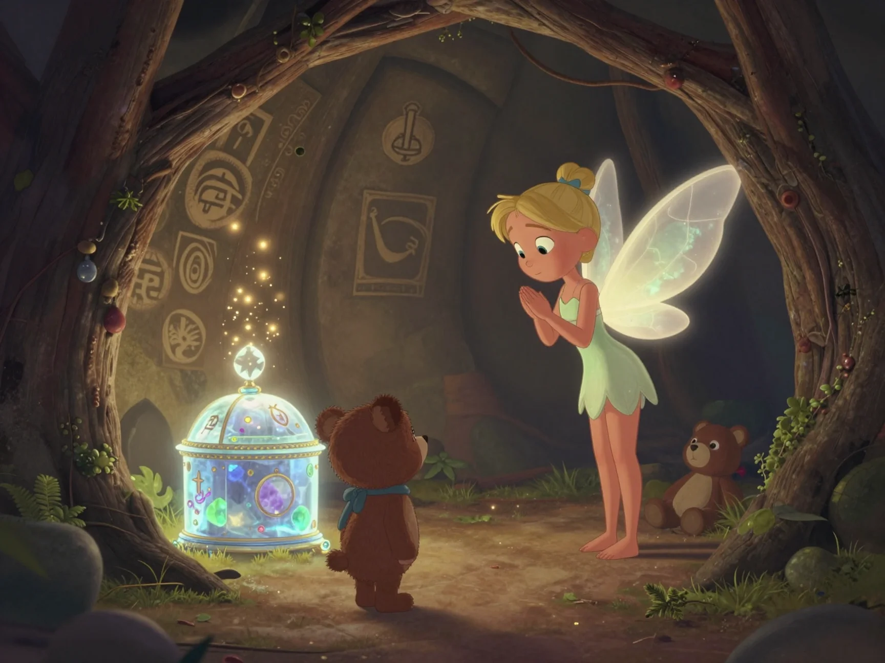 — Смотрите! — воскликнула я, залетая внутрь. — Краски почти погасли. Нам нужно действовать быстро. В этой пещере эхо повторяет каждое слово, но оно превращает его в то, что ты чувствуешь. Если мы будем говорить добрые слова, пещера наполнится светом!