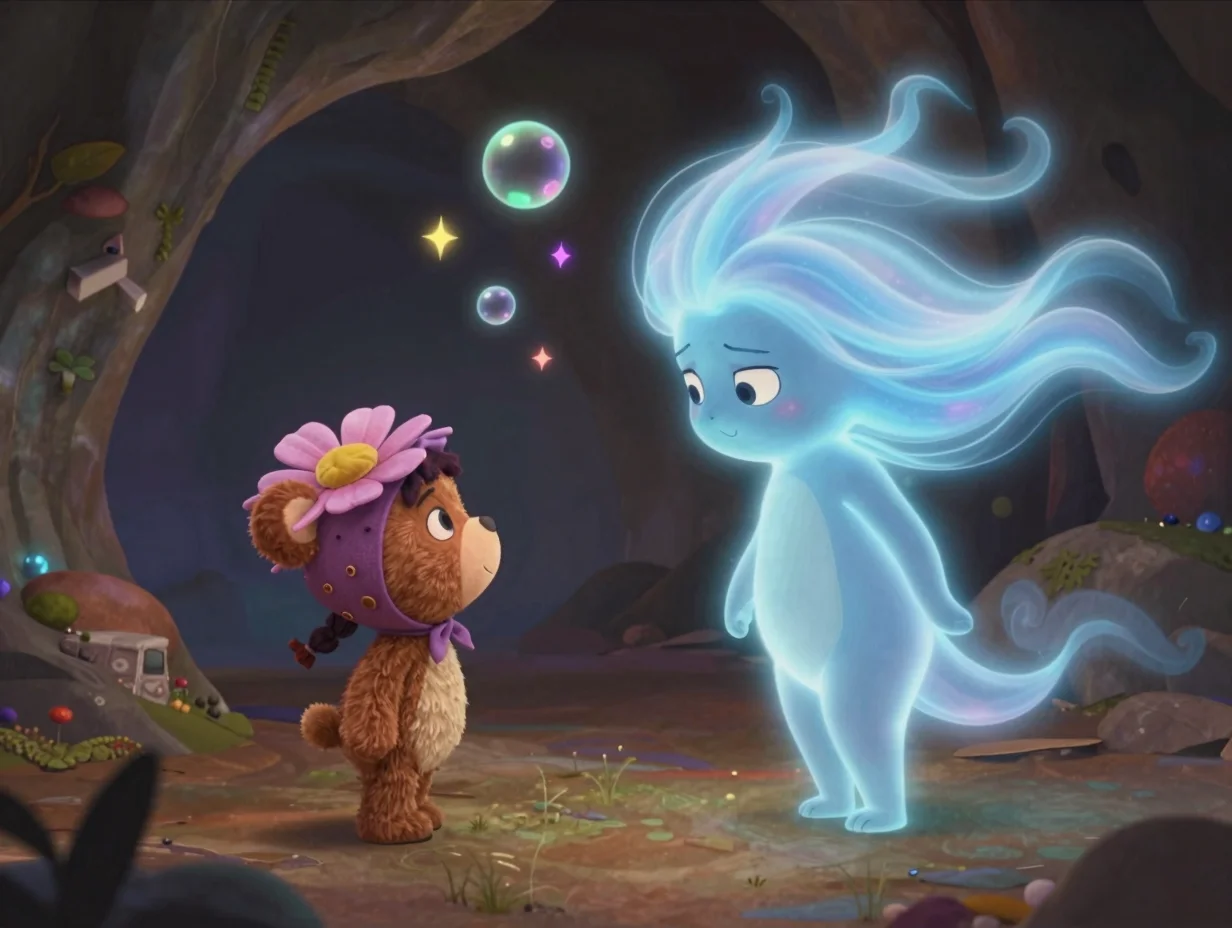 Северный Сквозняк вылетел из тёмного угла пещеры, раздувая свои ледяные щёки. Он выглядел как большое прозрачное облако с длинным носом-сосулькой и бровями из инея. Но Тая не испугалась. Она подмигнула Потапу, и медвежонок понял её без слов.