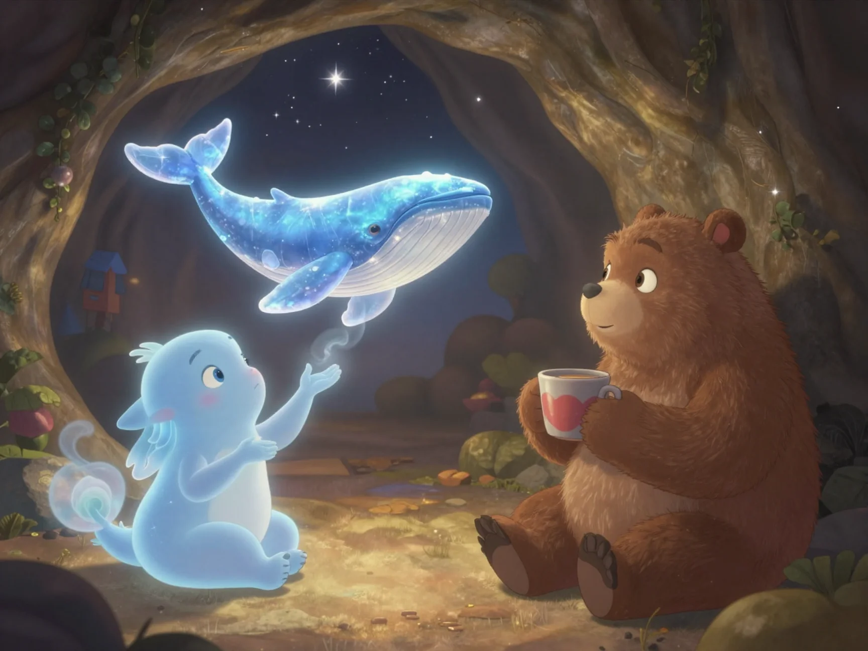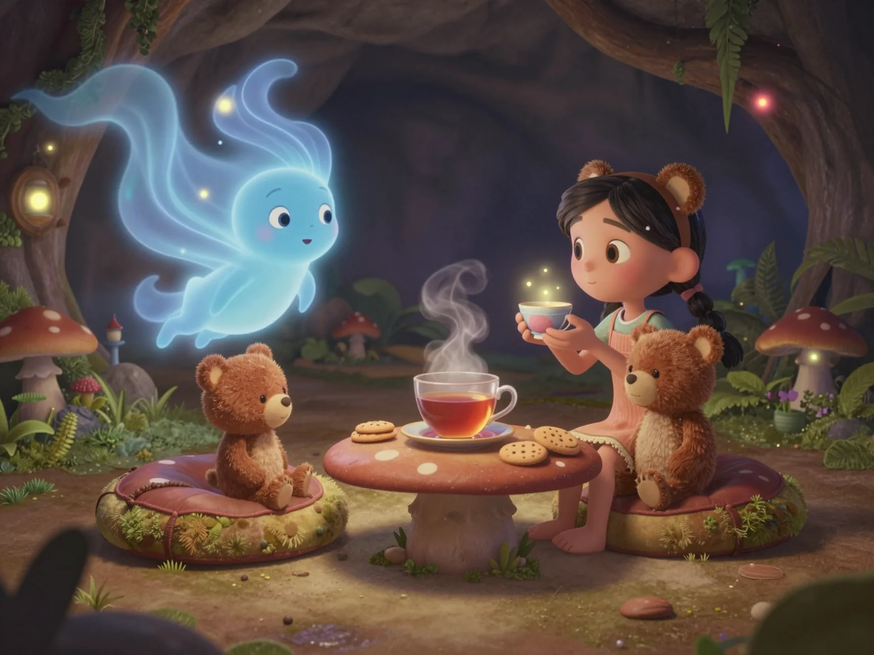 Потап с важным видом открыл свой походный рюкзачок и достал оттуда скатерть-самобранку, расшитую звёздами. В мгновение ока на большом плоском камне посреди пещеры появились чашки с ароматным липовым чаем, вазочка с малиновым вареньем и печенье в форме полумесяцев. Я взмахнула своим фонариком, и над столом закружились маленькие светлячки, создавая уютный свет.