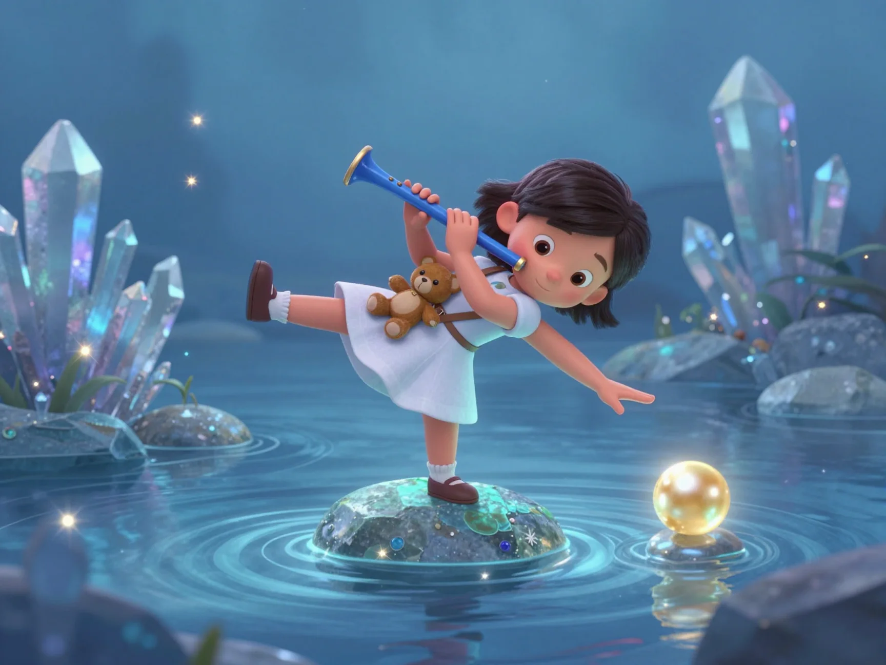 Тая подошла к самой кромке воды. Она знала, что вода любит ласку. Девочка присела на большой плоский камень, который был тёплым от дневного солнца, и достала свой магический стетоскоп. Она аккуратно опустила его чувствительный наконечник в воду. Сначала она слышала только мерное буль-буль, но потом, закрыв глаза и сосредоточившись, Тая уловила дивную мелодию.