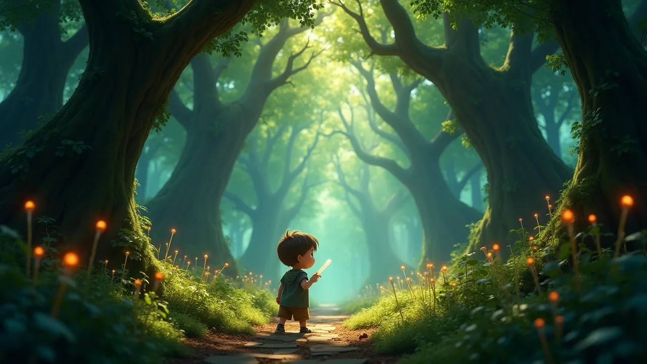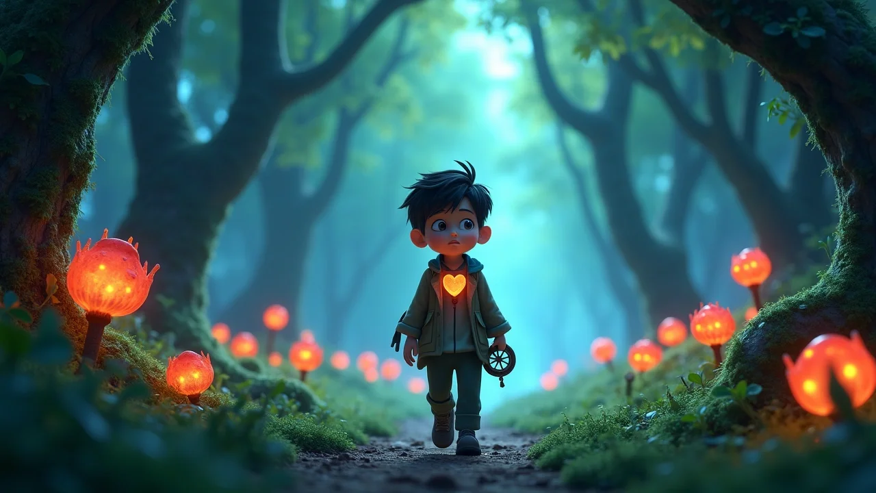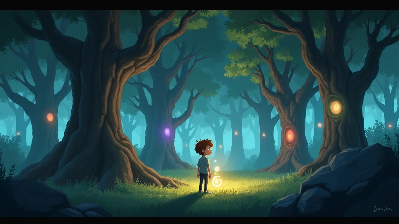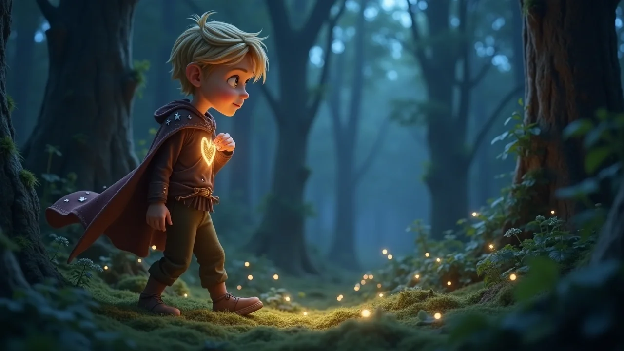 Страх перед темнотой, который обычно подкрадывался к Тимофею с наступлением вечера, вдруг отступил. Любопытство победило! Да и к тому же, камень в его руке нежно пульсировал теплом, а его "фонарик в сердце" лежал в кармашке, придавая уверенности. Он крепко сжал таинственный сияющий камень, взял поглубже вдох и, не раздумывая, шагнул вслед за искрой в темную чащу леса, туда, где обычные люди боялись и шагу ступить после захода солнца.