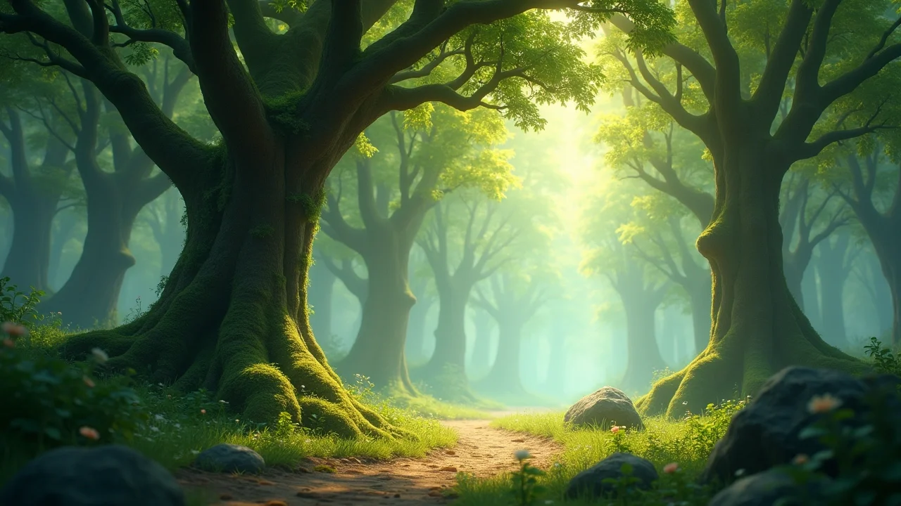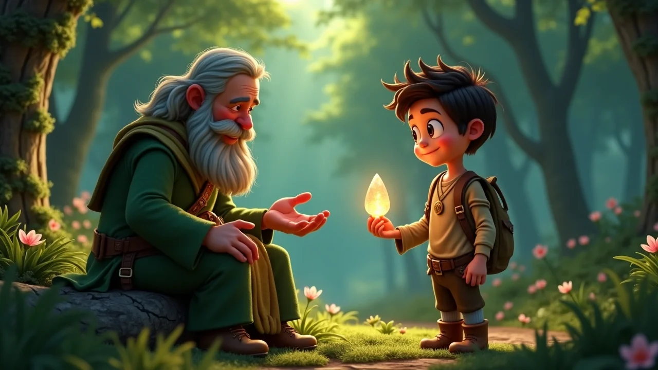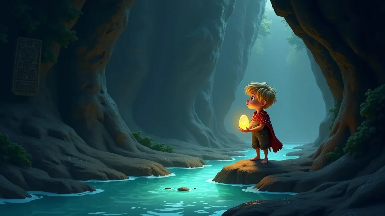 Путь привел его к потайной пещере, спрятанной под могучими корнями. Вход в неё был прикрыт густыми лианами, которые, казалось, сами раздвинулись, пропуская мальчика. Внутри пещера оказалась намного просторнее, чем он предполагал, и заполнена древними мхами, светящимися мягким изумрудным светом. Посреди пещеры стоял старинный стол, вырезанный из единого куска корня, а на нём лежал старинный пергамент, запечатанный воском. От пергамента исходило слабое сияние, такое же, как от его камня.