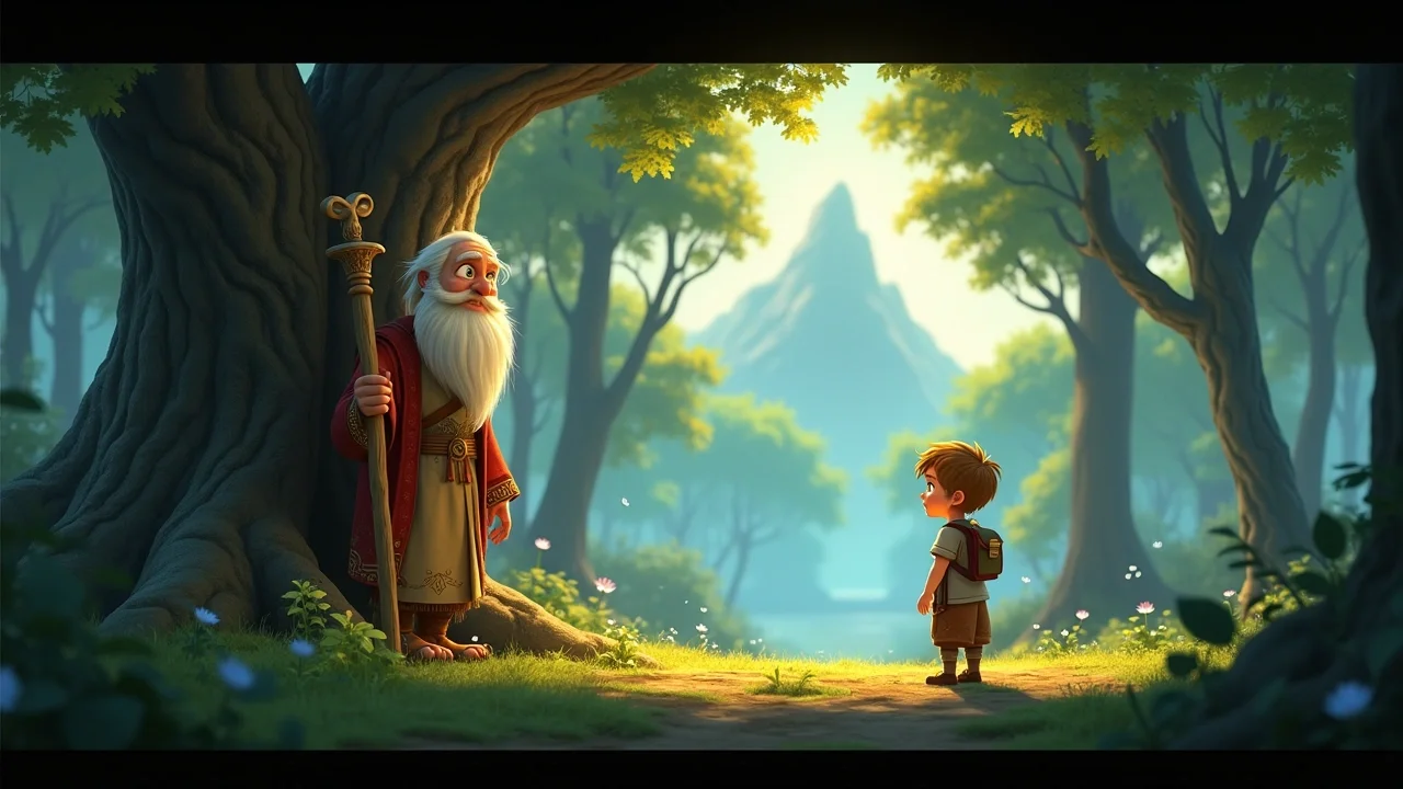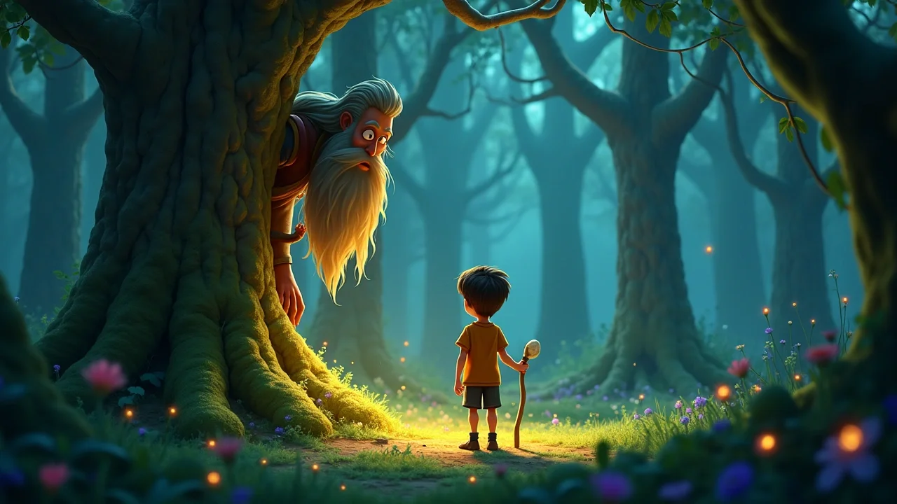Вскоре тропинка привела её к небольшой поляне, посреди которой рос огромный дуб. Его крона была такой широкой, что казалось, она обнимает весь мир, а ствол был таким толстым, что его не обхватили бы и десять человек. Под дубом, прислонившись к его могучему стволу, сидел старик. Он был весь седой, с длинной бородой, которая почти касалась земли, и глазами, глубокими, как лесные озёра, в которых отражалась вековая мудрость. Одет он был в простую льняную рубаху и лапти, а в руке держал посох, украшенный причудливой резьбой.