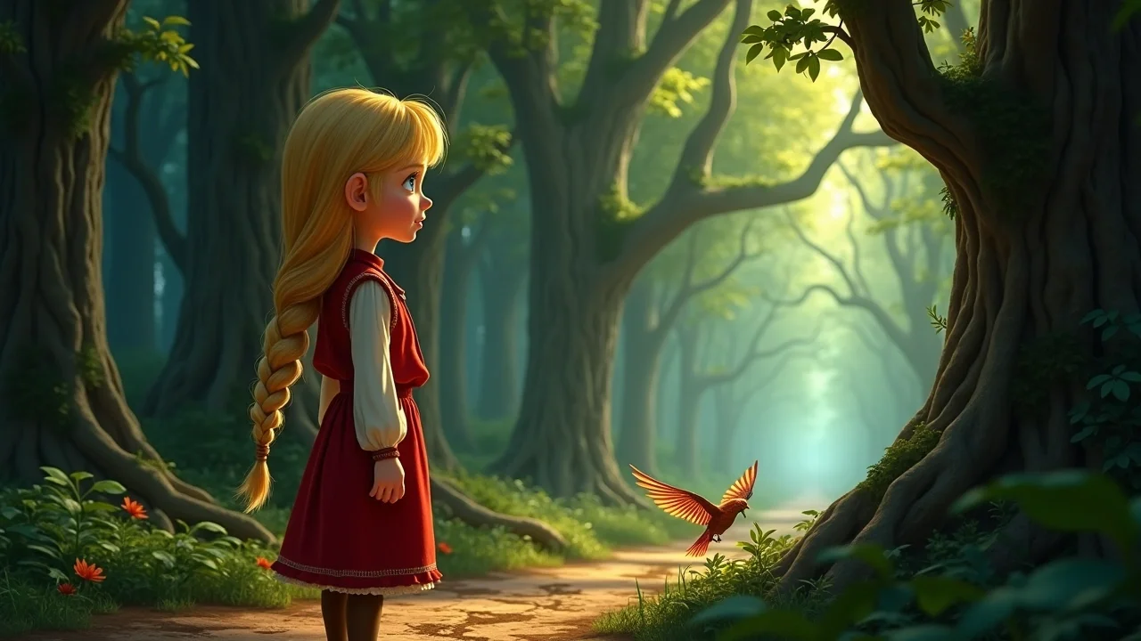 Алёнушка поклонилась Лесовику и, крепко сжимая пёрышко Жар-птицы, отправилась дальше, в самую чащу заколдованного леса. Клубочек вновь покатился вперёд, указывая ей путь. Лес вокруг неё зашумел, но теперь это был не настораживающий шепот, а скорее ласковый вздох, словно деревья приветствовали её и желали удачи. Она чувствовала, что впереди её ждут новые приключения и, возможно, новые загадки. Но она была готова. Ведь ради сестрицы она готова была пройти через любые испытания.
