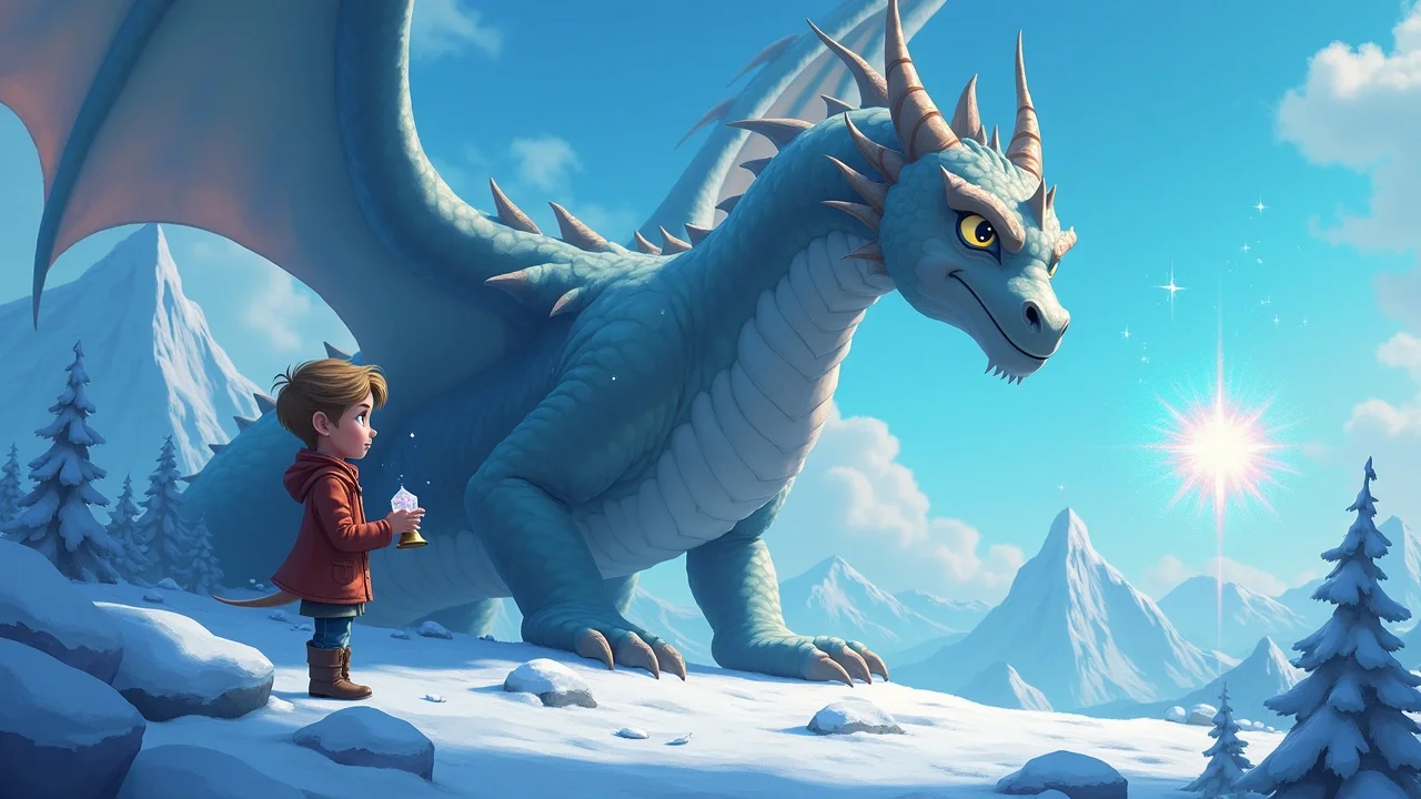 Наконец, после долгих часов восхождения, он достиг вершины. Над ним расстилалось бесконечное звёздное небо, такое близкое, что казалось, можно дотянуться рукой и схватить горсть сияющих жемчужин. В центре огромной скальной площадки, окутанной мистическим светом, возвышалась древняя Чаша Исцеления. Она была сделана из мерцающего, прозрачного льда, наполненного живительной, серебряной водой, которая переливалась всеми цветами радуги. Но не она притягивала взгляд. За Чашей, словно древний страж, сидел ОН – Дракон Зеркальных Грёз.