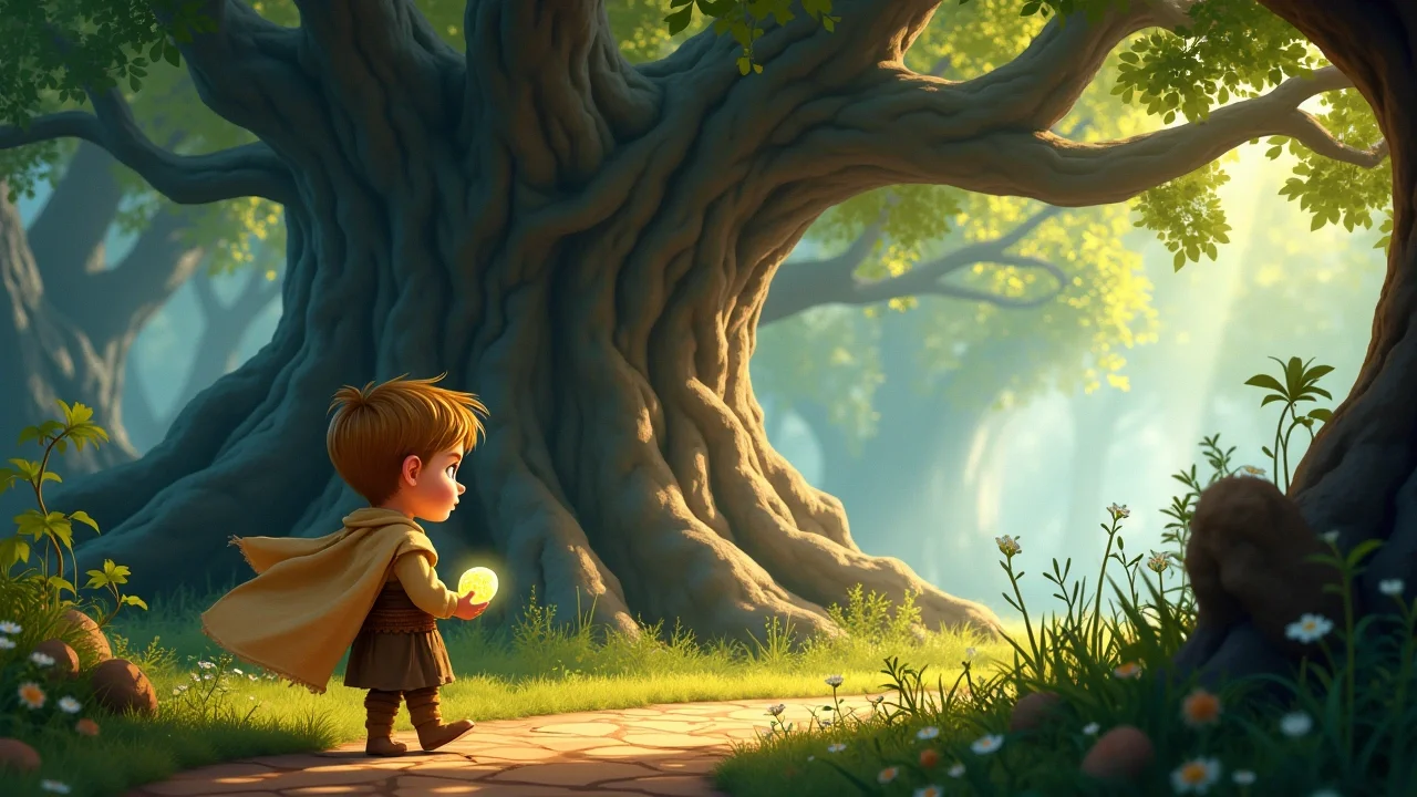 Наконец, он приблизился к Дубу-Великану. Дерево было исполинским, таким высоким, что его верхушка терялась в облаках. Ствол его был испещрен глубокими морщинами, словно картой прожитых веков, а толстые корни, похожие на спящих змей, уходили глубоко в землю. От Дуба веяло не только древностью, но и какой-то доброй, но строгой мудростью. В самом низу, среди корней, виднелась небольшая арка, скрытая мхом и переплетенными ветвями.