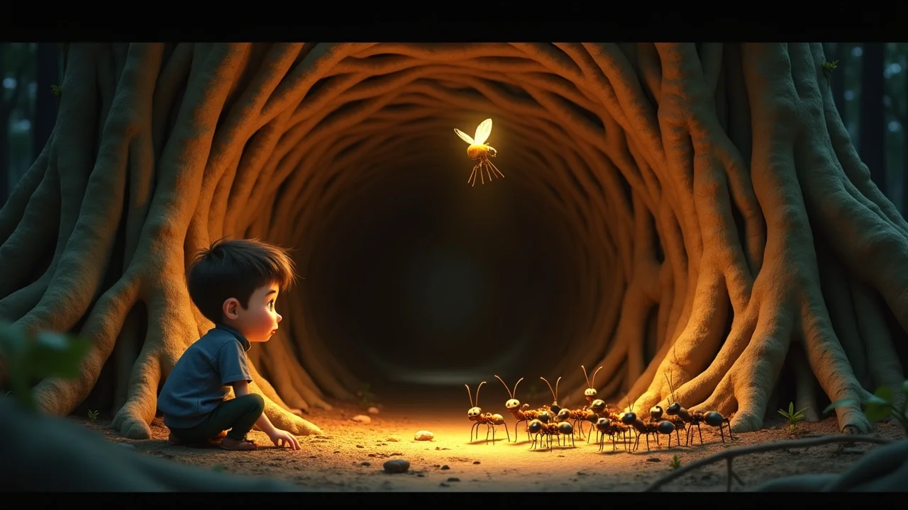 Найдя вход в муравейник, Лесенька аккуратно опускается на колени, чтобы быть поближе. Муравейник был не просто кучей земли, а настоящим архитектурным чудом, с маленькими, искусно сделанными ходами, переплетающимися между корнями деревьев. Он видит множество муравьёв, снующих туда и обратно, занятых своими важными делами. Он ждал, как Мудрая Уха ему советовала, чтобы муравьи сами почувствовали его присутствие и доброту.