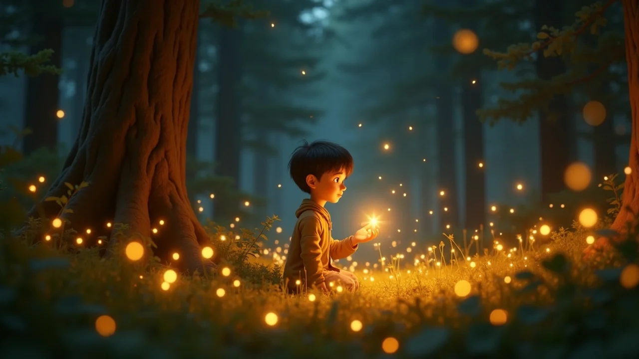 Когда он добрался до поляны, зрелище, открывшееся его взору, было просто волшебным. Сотни, если не тысячи, светлячков мерцали в воздухе, создавая живые узоры. Они поднимались вверх и опускались вниз, словно невидимая кисть рисовала светом прямо в темноте. Это было похоже на маленький, светящийся танец, который исполнялся только для Лесеньки. Он тихо присел на поваленное бревно, боясь спугнуть эту сказочную красоту, и стал внимательно присматриваться. Он видел огонёк, который сиял желтоватым светом, совсем как кусочек солнца. Другой светился нежно-голубым, будто пойманный кусочек ночного неба. Третий пульсировал зелёным, напоминая о молодой листве. Казалось, что каждый огонёк имеет свою маленькую душу, свой характер.