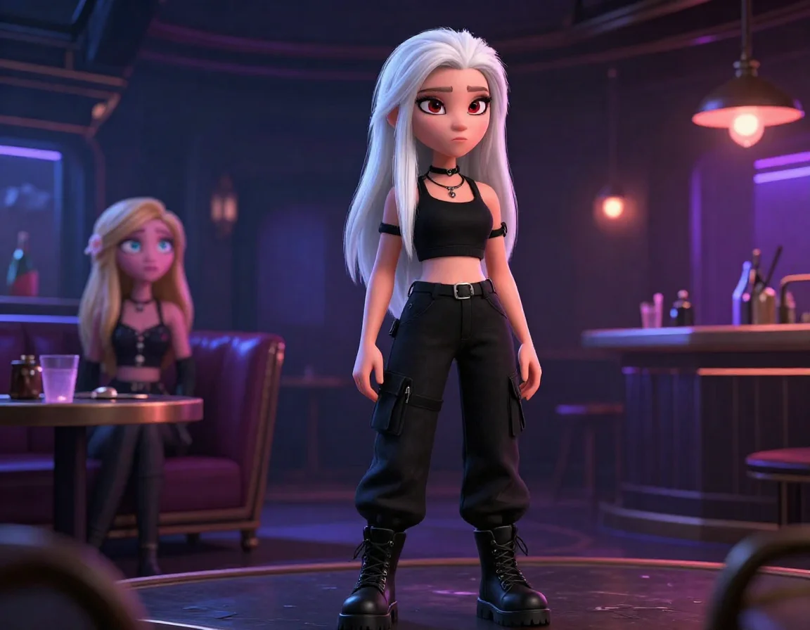 Они поднялись в скрытую от посторонних глаз комнату. Здесь не было шума танцпола, только приглушённый джаз и мягкий свет красных неоновых ламп. Афина по-хозяйски развалилась в глубоком кожаном кресле, закинув ноги в тяжёлых берцах прямо на лакированный столик. Чёрный топ подчёркивал её атлетичную фигуру, а белые волосы сияли в полумраке.