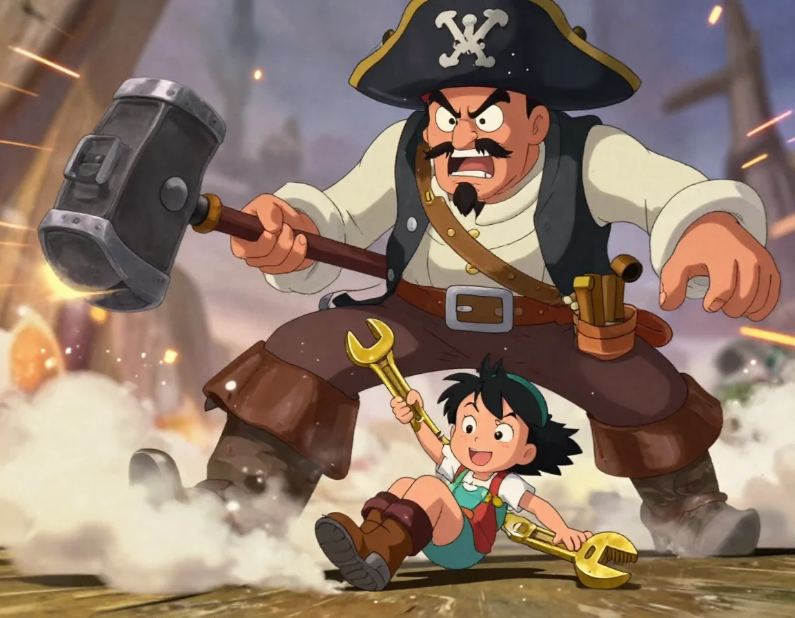 Первый помощник капитана, по прозвищу Грохот, замахнулся своим огромным паровым молотом. Тяжёлый металл со свистом рассёк воздух, едва не задев плечо Аири. Девочка ловко перекатилась по доскам причала, сжимая свой верный гаечный ключ.