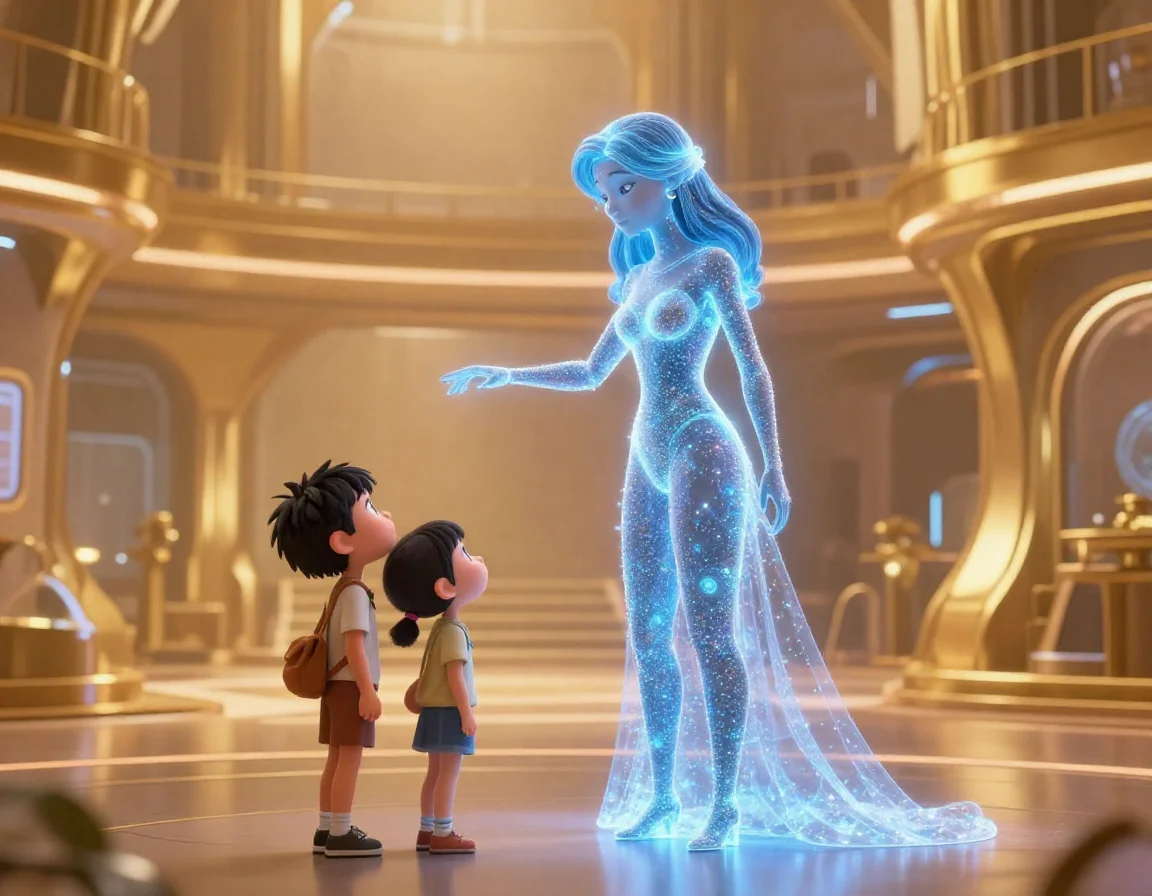 Внезапно пол под их ногами засиял, и перед ними возникла голограмма высокой женщины в одеждах, расшитых созвездиями. Её глаза светились тем же лазурным светом, что и кристалл.