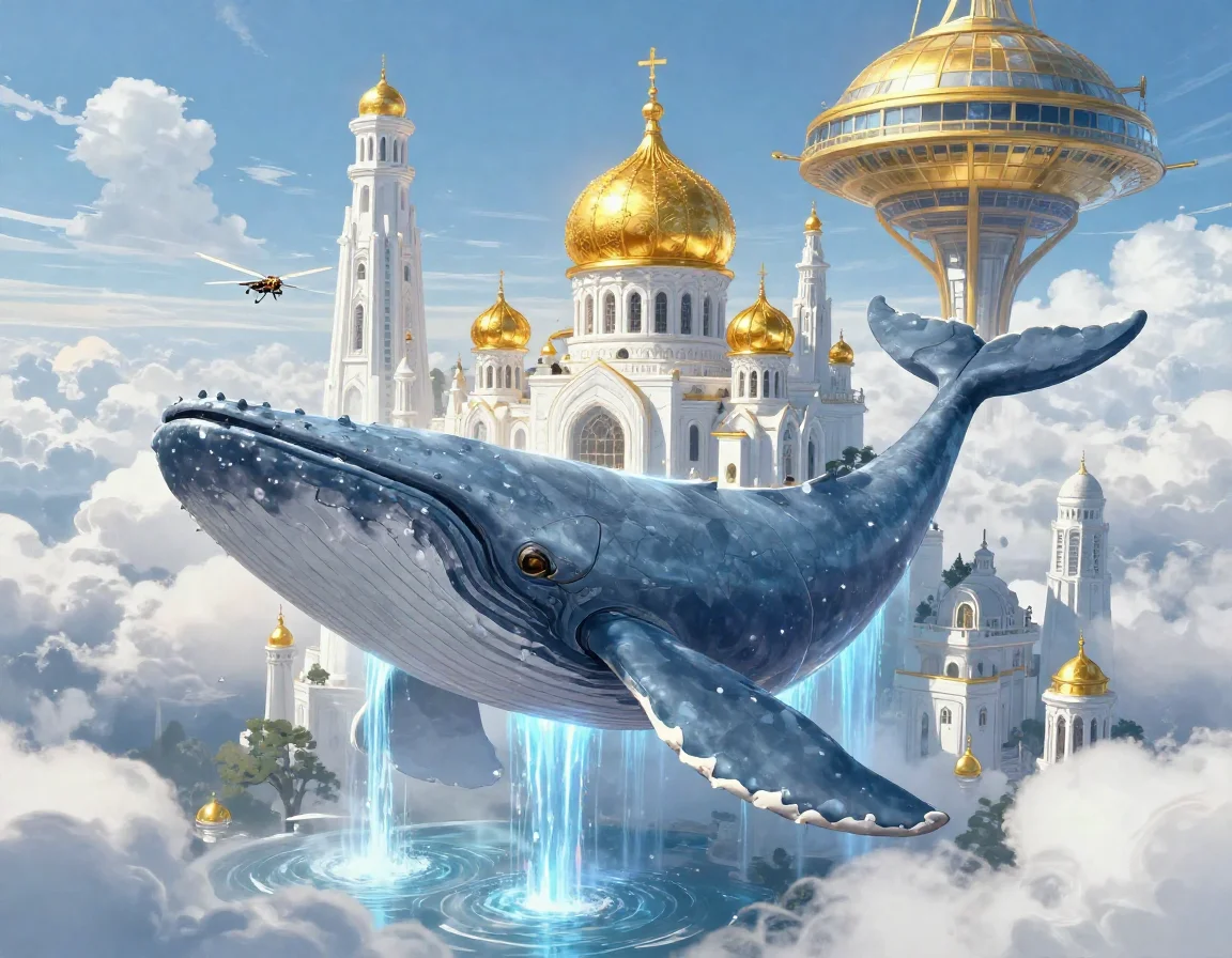 Когда зрение вернулось к ним, они увидели нечто невероятное: огромный город, построенный из белого мрамора и золота, парил на спине гигантского механического кита, чьи плавники медленно разрезали облака. Это был легендарный Левиафан — хранитель небесного равновесия.