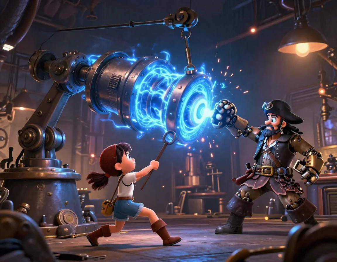 Аири резко прыгнула к главному пульту управления мастерской. Её пальцы привычно пробежали по медным тумблерам. Капитан Морган уже занёс свой тяжёлый механический кулак, чтобы разнести верстак, под которым прятался Кай, но девочка была быстрее.