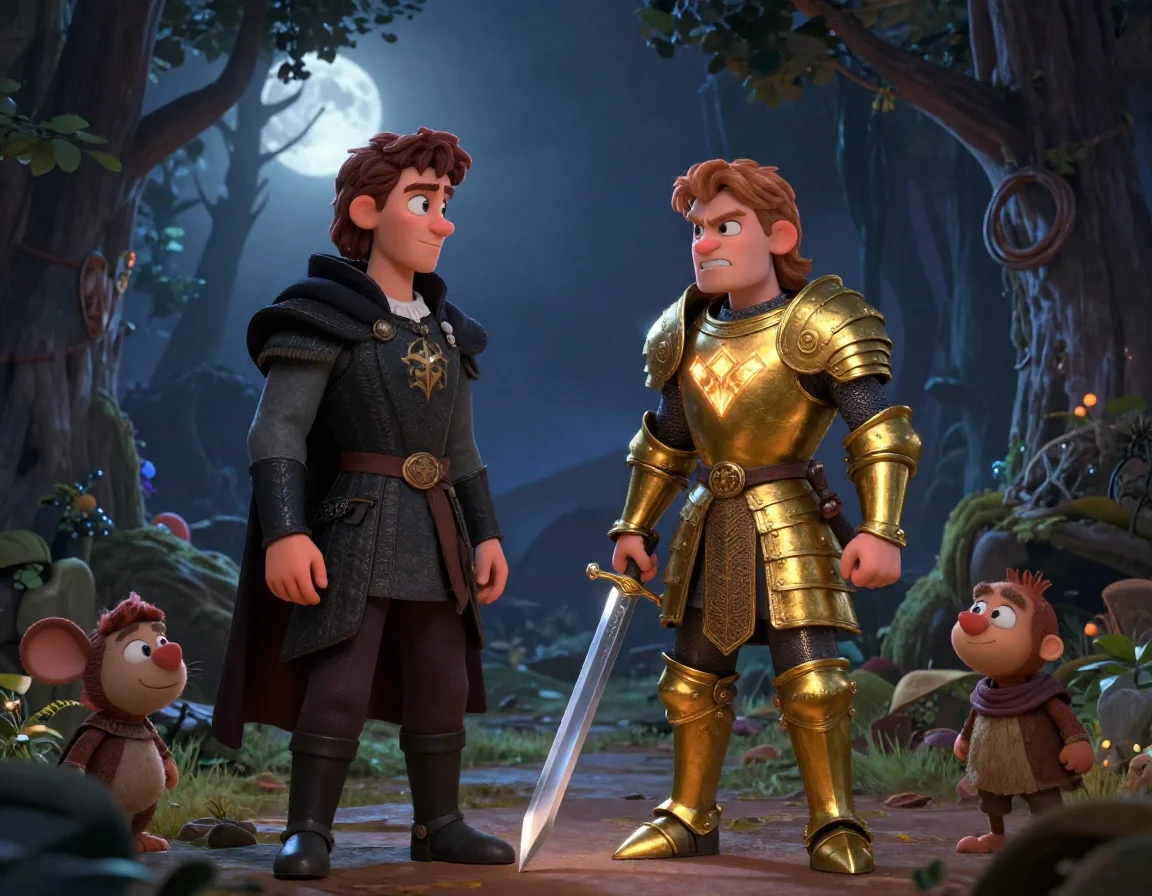 Однажды ночью они столкнулись с отрядом стражников, которые пытались сжечь дом бедного кузнеца за неуплату податей. Яшка уже занёс свой тяжёлый меч, но Мирослав остановил его знаком руки. Он вышел вперёд, и его глаза вспыхнули янтарем, как у чудовища из оврага. Из лесной чащи раздался оглушительный рёв его нового друга — лесного зверя. Стражники, побросав факелы, в ужасе бежали, крича о «Лесном Царе».