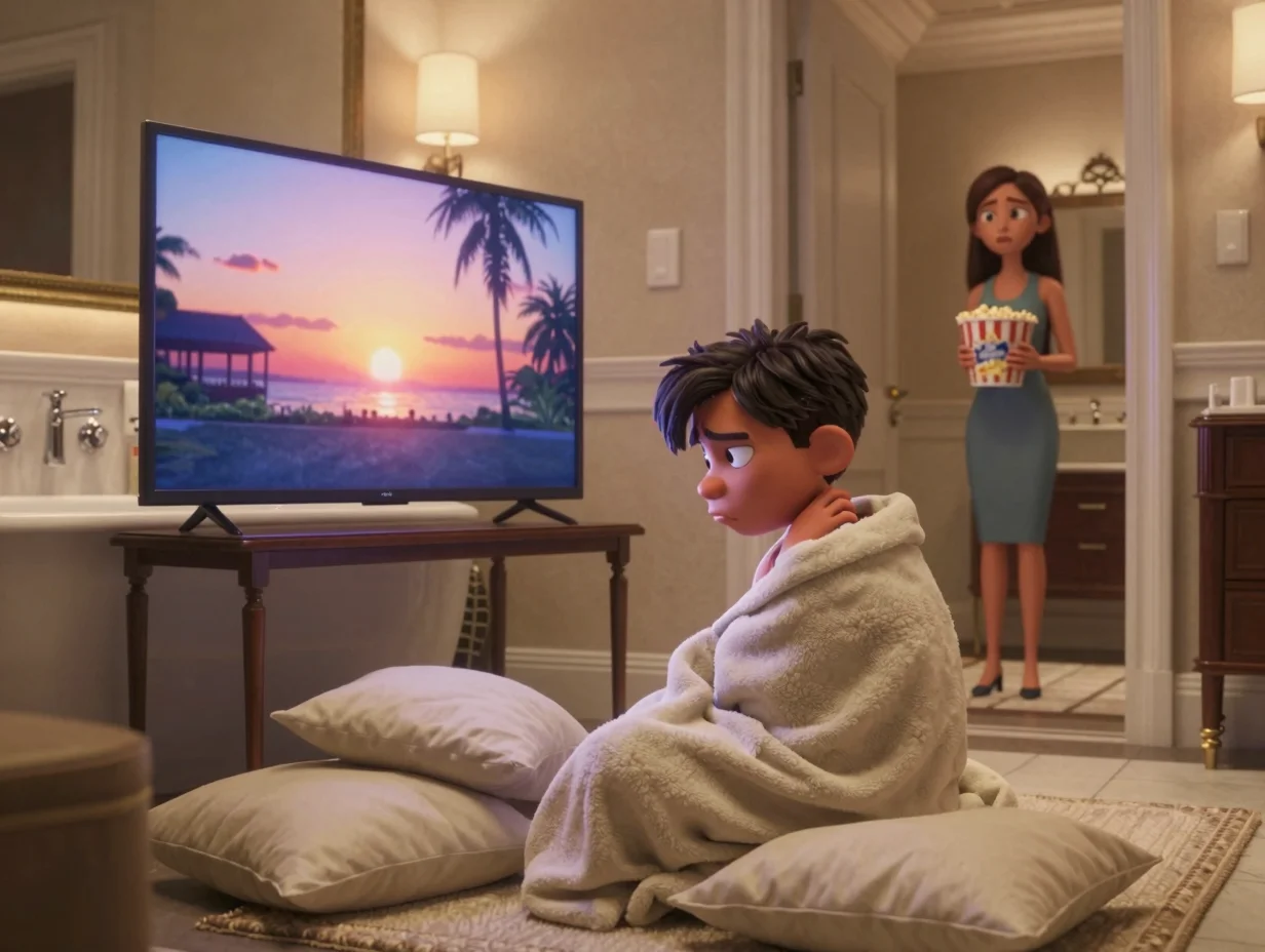Нора решила, что тишина — худший враг для Кори. Вместе с Ариэль они совершили настоящий подвиг: перетащили огромный плазменный телевизор из гостиной и установили его на табурет прямо напротив ванны. Паркер ворчал, что техника сгорит от влажности, но Нора была непреклонна.