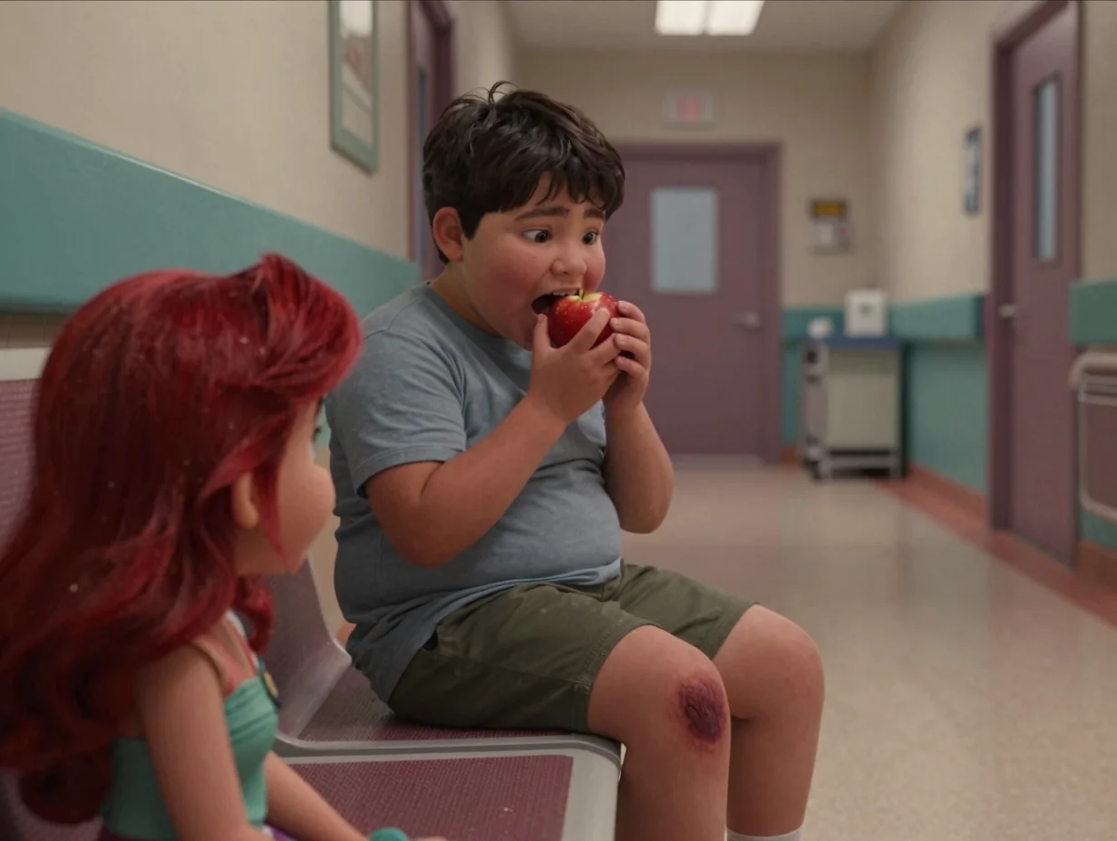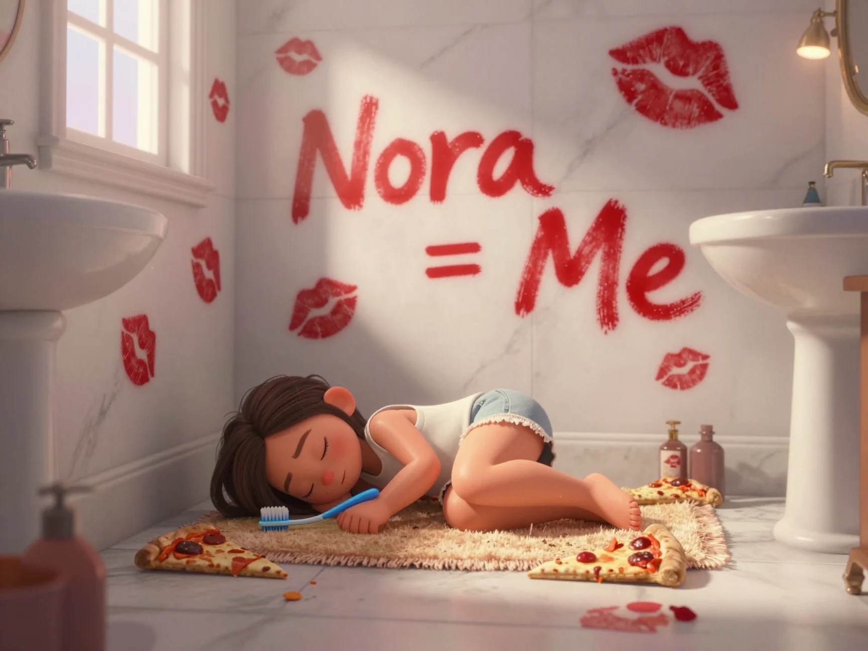 Сам виновник торжества лежал на коврике, свернувшись калачиком. Он выглядел таким беззащитным и измотанным ночной борьбой с зудом. В руках он крепко сжимал синюю зубную щётку Паркера, словно это был его единственный талисман в этом кафельном изгнании. Он тихо сопел, и на его щеке виднелся красный след от помады — видимо, он случайно задел стену во сне.