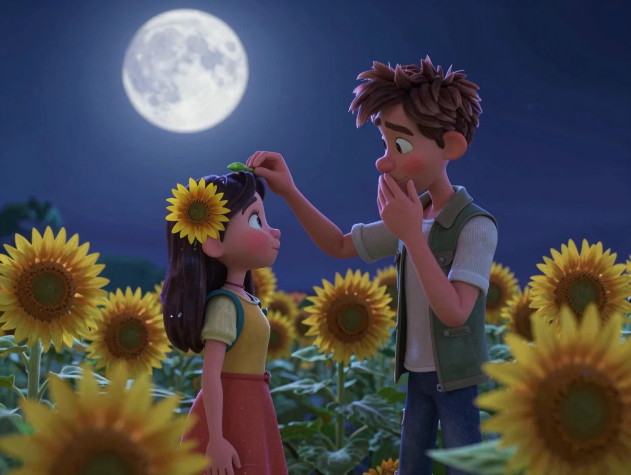 Они бежали долго, пока городские огни не сменились мягким золотистым свечением. Перед ними открылось бескрайнее поле подсолнухов, чьи головы склонились под тяжестью ночной росы. В свете луны они казались застывшими стражами их тайны. Кори привёл её в самый центр, где цветы были выше человеческого роста.