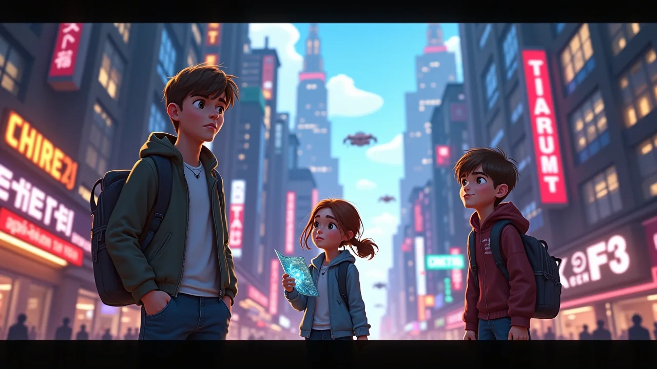 Петя, теперь пятнадцатилетний подросток, сохранил ту же искорку в глазах, но стал чуть выше, увереннее. Его волосы немного отрасли, а улыбка стала реже, но зато искреннее. Рядом с ним стояли его верные друзья. Лиза, такая же рассудительная, но теперь вместо карт Пиксельного Леса в её руках был голографический планшет, проецирующий сложную карту Мегаполиса. Её взгляд, как и прежде, был проницательным, но в нём появилось нечто новое – жажда исследований уже не древних руин, а футуристических технологий. Максим, всё такой же добродушный и надёжный, нёс на спине внушительный рюкзак, где хранился запас самых невероятных гаджетов и перекусов. Он с восхищением оглядывался вокруг, его глаза сияли от впечатлений.