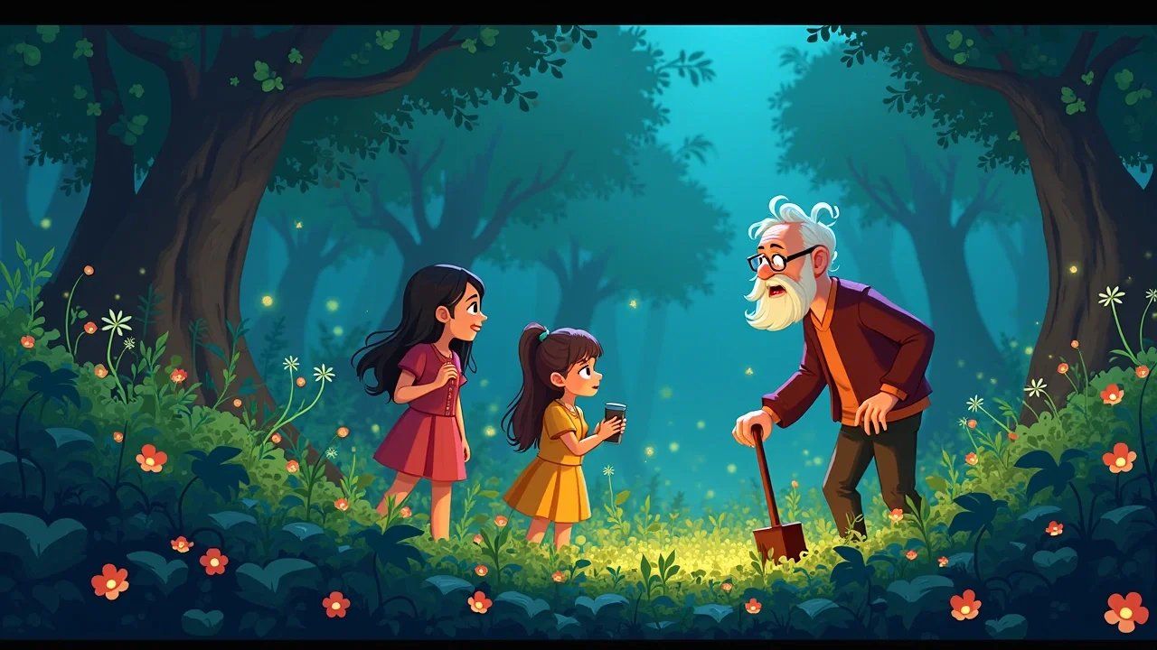 Вдруг, из-за одного из светящихся кустов, появился старый, слегка растрёпанный садовник с сияющей лопатой в руке. Его одежда была похожа на ту, что носили древние пиксель-земледельцы, но сама ткань переливалась, как водная гладь. На лице садовника читалась лёгкая растерянность, словно он только что потерял свои инструменты или забыл, что собирался делать.