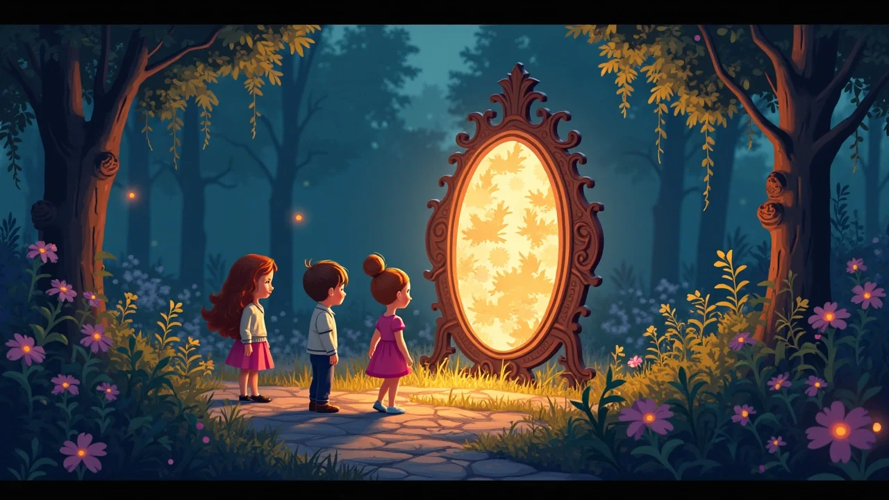 Последним подошёл Петя. Он глубоко вздохнул и посмотрел в мерцающую поверхность. Зеркало показало его, маленького, сидящего на опушке леса, смотрящего в далёкое небо, мечтающего о приключениях. И вдруг рядом появились образы Лизы и Максима, бегущих к нему, их смех раздавался в эхо. «Моя мечта всегда была о великих приключениях, — сказал Петя, и в его голосе слышалась дрожь. — Но я понял, что самые яркие приключения — это те, что ты делишь с друзьями. Именно вы двое сделали все эти мечты реальностью».