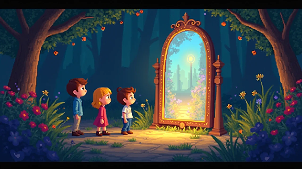 Вскоре они вышли на небольшую поляну, где в центре стояло старое, искривлённое Зеркало Грёз. Его поверхность была не гладкой, а состояла из множества крошечных, постоянно меняющихся пикселей, словно далёкие отголоски мыслей. Когда друзья приблизились, зеркало начало оживать, показывая размытые образы их детства. Это были моменты их первых встреч, игр в прятки за деревьями Глухого Пиксельного Леса, первых смешных ссор и примирений.