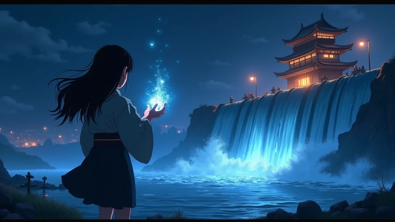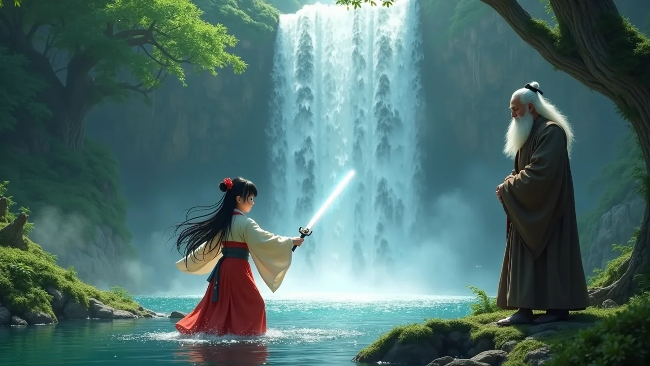 Юкико кивнула, крепко сжимая рукоять Зеркального Меча Кагами-но-Цуруги. Она встала на скользкие камни у подножия водопада, закрыла глаза и глубоко вдохнула влажный, свежий воздух. Сначала было трудно. Холодные брызги обжигали кожу, шум воды заглушал все мысли. Но Юкико вспомнила слова отца о сосредоточенности и уроки Мастера о гармонии. Она представила, как её тело становится лёгким, как капля воды, как её движения плавны и текучи, как сам водопад.