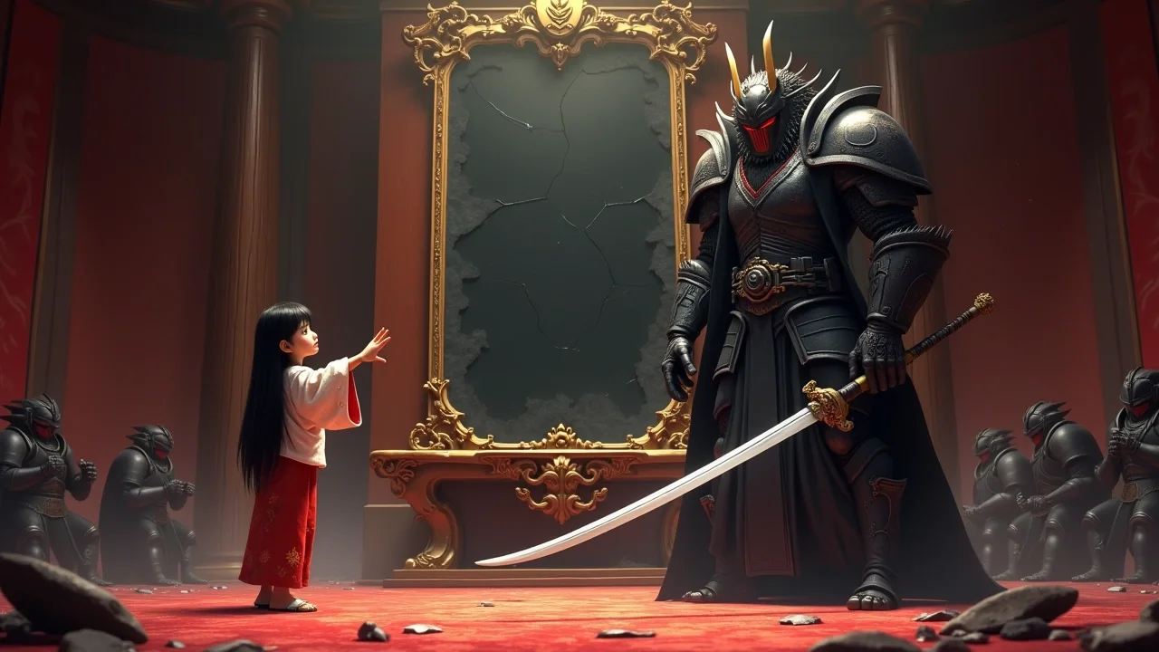 Комната была огромной и богато обставленной, но в ней царила мрачная атмосфера. В центре стоял трон, на котором восседал Чёрный Змей – высокий, худощавый мужчина с острыми чертами лица и глазами, полными холодной жестокости. Рядом с ним, на пьедестале, стояло Зеркало Тьмы – большой, чёрный диск, излучающий зловещее сияние. Его поверхность была словно бездонная пропасть, в которой отражались самые тёмные страхи. Чёрный Змей и его приспешники обернулись, их лица исказились от удивления и ярости, когда они увидели маленькую фигурку Юкико, стоящую в дверном проёме. «Кто ты такая?!» – прорычал Чёрный Змей, его голос был полон угрозы. Юкико подняла Зеркальный Меч, его лезвие ярко вспыхнуло в полумраке. «Я – Юкико, дочь клана Сакура, и я пришла, чтобы вернуть честь моему роду и положить конец твоей тирании!» Битва была неизбежна. Но сможет ли Юкико, даже со всеми своими силами, одолеть Чёрного Змея и его Зеркало Тьмы?