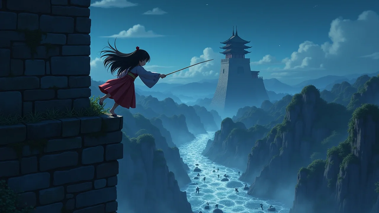 Дождавшись, пока основная масса воинов Орочи бросится к речным воротам, пытаясь справиться с «наводнением», Юкико начала своё восхождение. Она использовала силу ветра, чтобы облегчить свой вес, и силу земли, чтобы найти надёжные выступы и трещины в каменных стенах. Её движения были бесшумны и грациозны, словно она была не человеком, а призраком, скользящим по отвесным скалам. Зеркальный Меч Кагами-но-Цуруги, прикреплённый к её поясу, слегка светился, отражая тусклый свет факелов, но Юкико двигалась так быстро, что её было почти невозможно заметить.