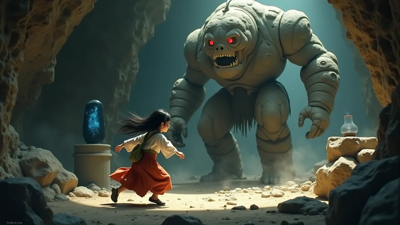 В одном из залов Юкико наткнулась на преграду – огромный валун, перекрывающий проход. На нём были высечены древние символы, которые она не могла прочесть. Вспомнив слова Мастера о смекалке, Юкико начала осматривать зал. Она заметила небольшую нишу в стене, где лежал старинный, покрытый пылью свиток. Развернув его, она увидела рисунки, изображающие, как древние люди использовали силу земли для перемещения камней. Это была загадка, которую нужно было разгадать.