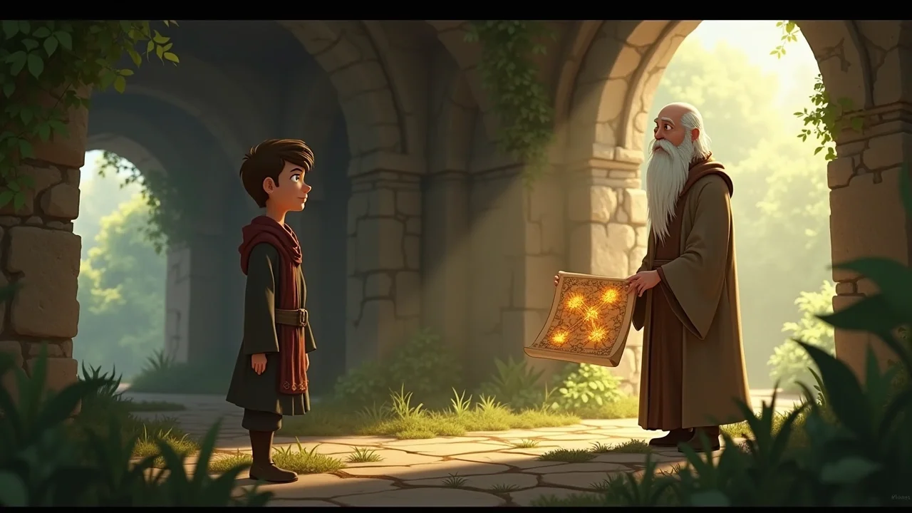 — Здравствуй, отче, — почтительно произнёс Иван-царевич, склонив голову. — Я Иван, сын царя, и пришёл к тебе за советом. Мой отец спит непробудным сном, а царство наше в упадке. Волшебная сова сказала, что лишь три артефакта могут спасти нас: Камень Света, Колокольчик Забвения и Перо Жар-птицы. Но куда мне идти, с чего начать?