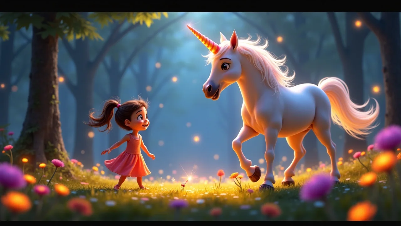 Бегая и прыгая, Анна углублялась всё дальше. Вдруг, среди высоких папоротников, она увидела что-то невероятное. Это было нечто такое, о чём она читала только в самых волшебных книжках! Перед ней стоял… единорог! Его шерсть была белой, как самый чистый снег, а грива и хвост переливались всеми цветами радуги. Но самое удивительное – это был его рог! Он сиял мягким, тёплым светом, словно маленькое солнышко, и вокруг него вились крошечные искорки.