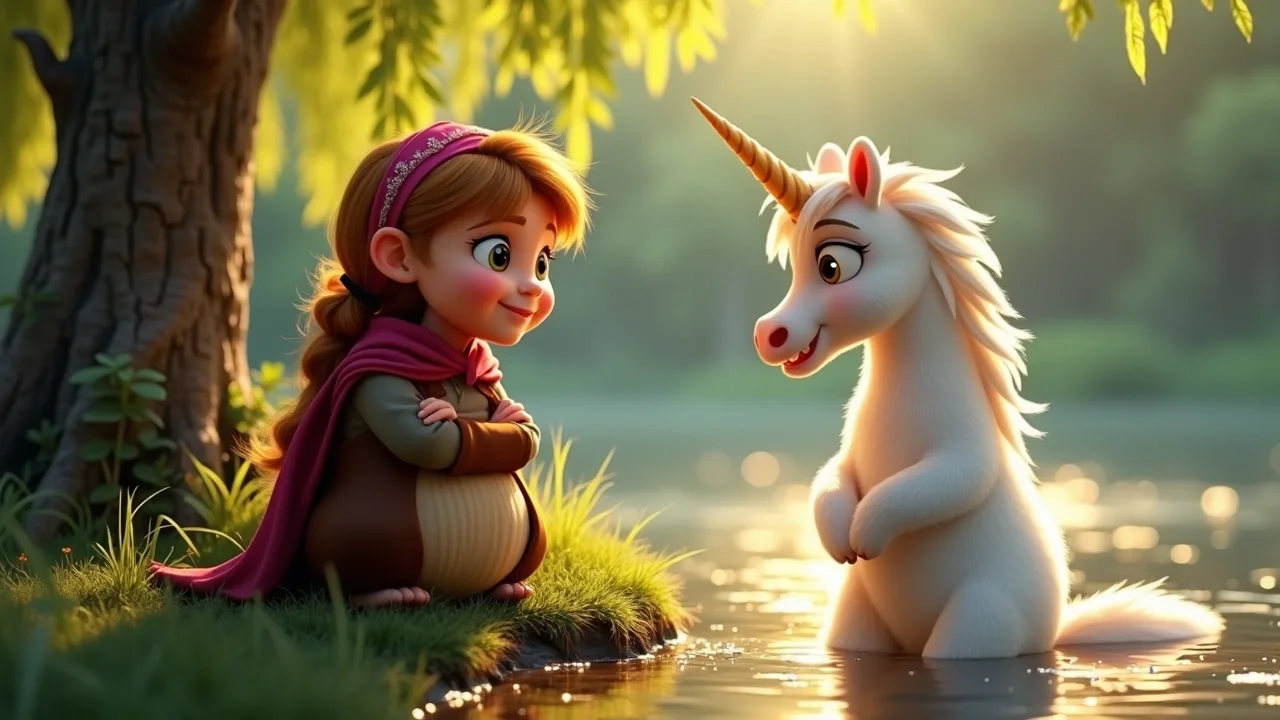 Единорог, казалось, был очень грустным. Он опустил голову, и его сияющий рог почти касался земли. Анна, хоть и была очень смелой, на мгновение замерла. Но её любопытство и желание помочь были сильнее страха. Она медленно подошла ближе. «Привет!» – тихо сказала Анна. Единорог поднял голову и посмотрел на неё своими большими, добрыми глазами. В них была такая печаль, что Анне сразу захотелось его обнять.