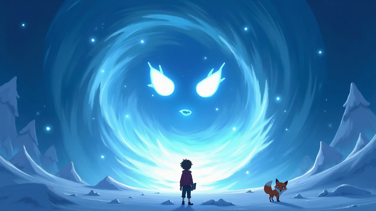 По мере того как Алёша говорил, он рисовал на бумаге не страшную бурю, а весёлый, тёплый ветерок, играющий с солнечными лучами. Рисунок начал светиться мягким золотистым светом. Вихрь замер. Снежные стены начали опадать, превращаясь в мягкие хлопья. Огромная воронка сузилась, и перед Алёшей предстал высокий, прозрачный силуэт, сотканный из мерцающего инея.