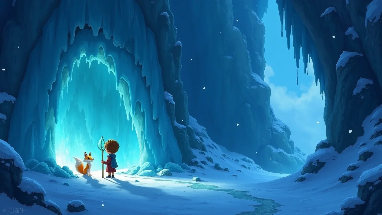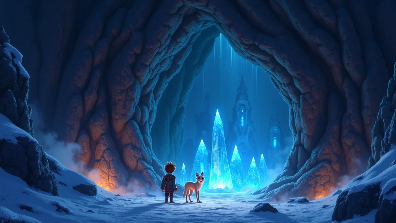 Вход в Пещеру Горного Эха напоминал пасть огромного каменного льва. С потолка свисали гигантские сосульки, которые светились мягким фиолетовым светом, освещая путь. Как только Алёша, Снежица и хрустальный Посох переступили порог, тишина взорвалась мириадами звуков.