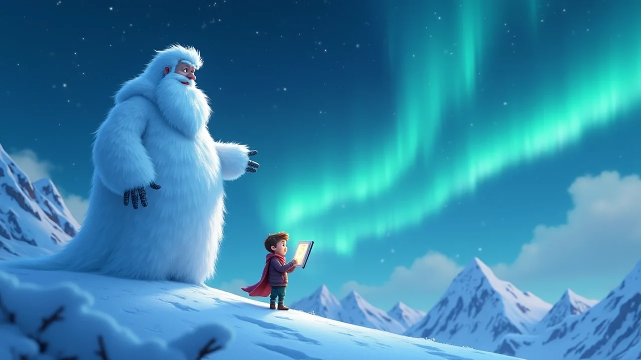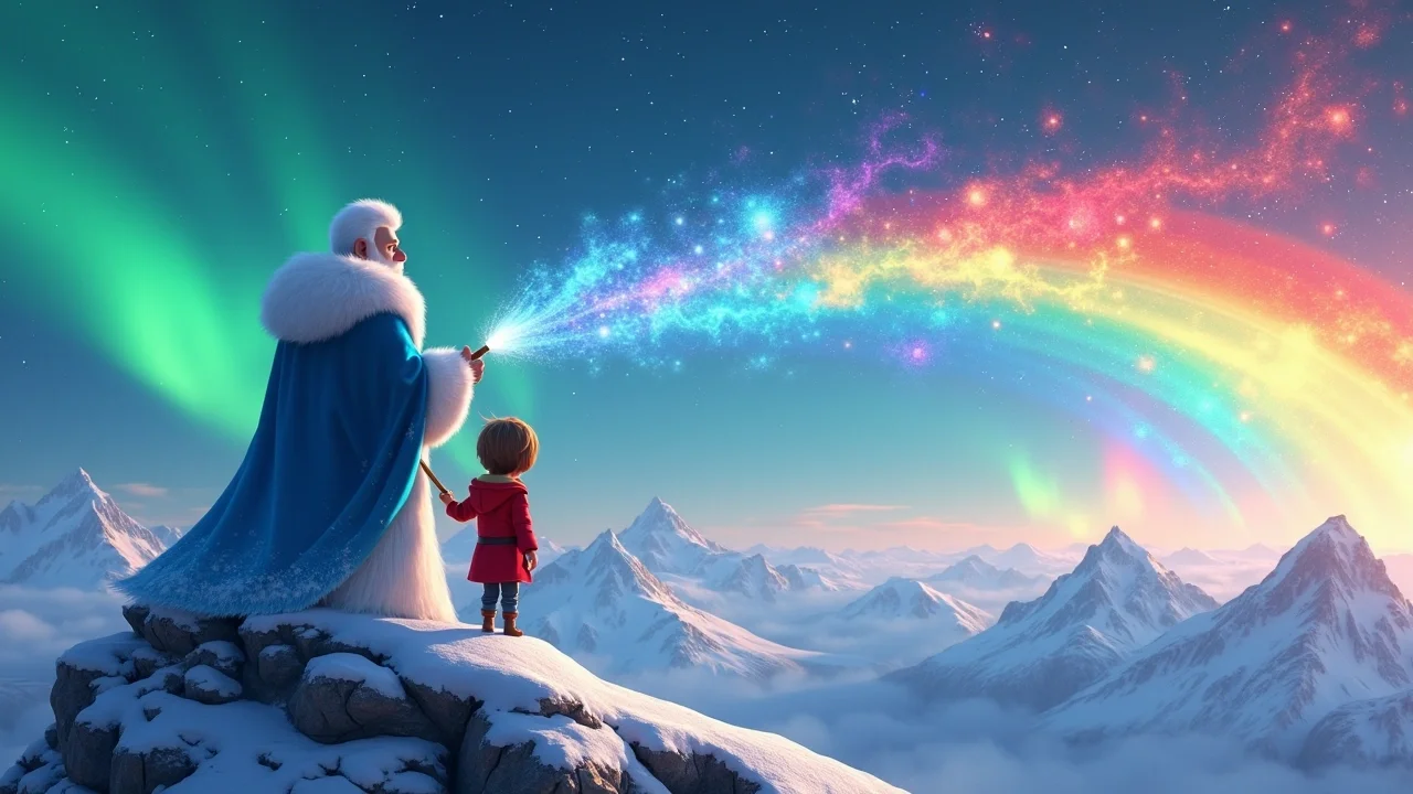 Алёша вышел из укрытия прямо навстречу ледяному ветру. На самой вершине, где небо сливалось с землёй в танце северного сияния, возвышался Старый Мороз. Его фигура казалась частью горы, а посох в его руках — обычная ледяная коряга — не светился. Увидев мальчика, Мороз нахмурил густые брови, и с них посыпался иней.