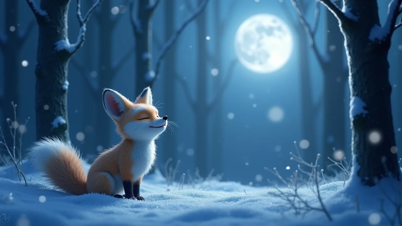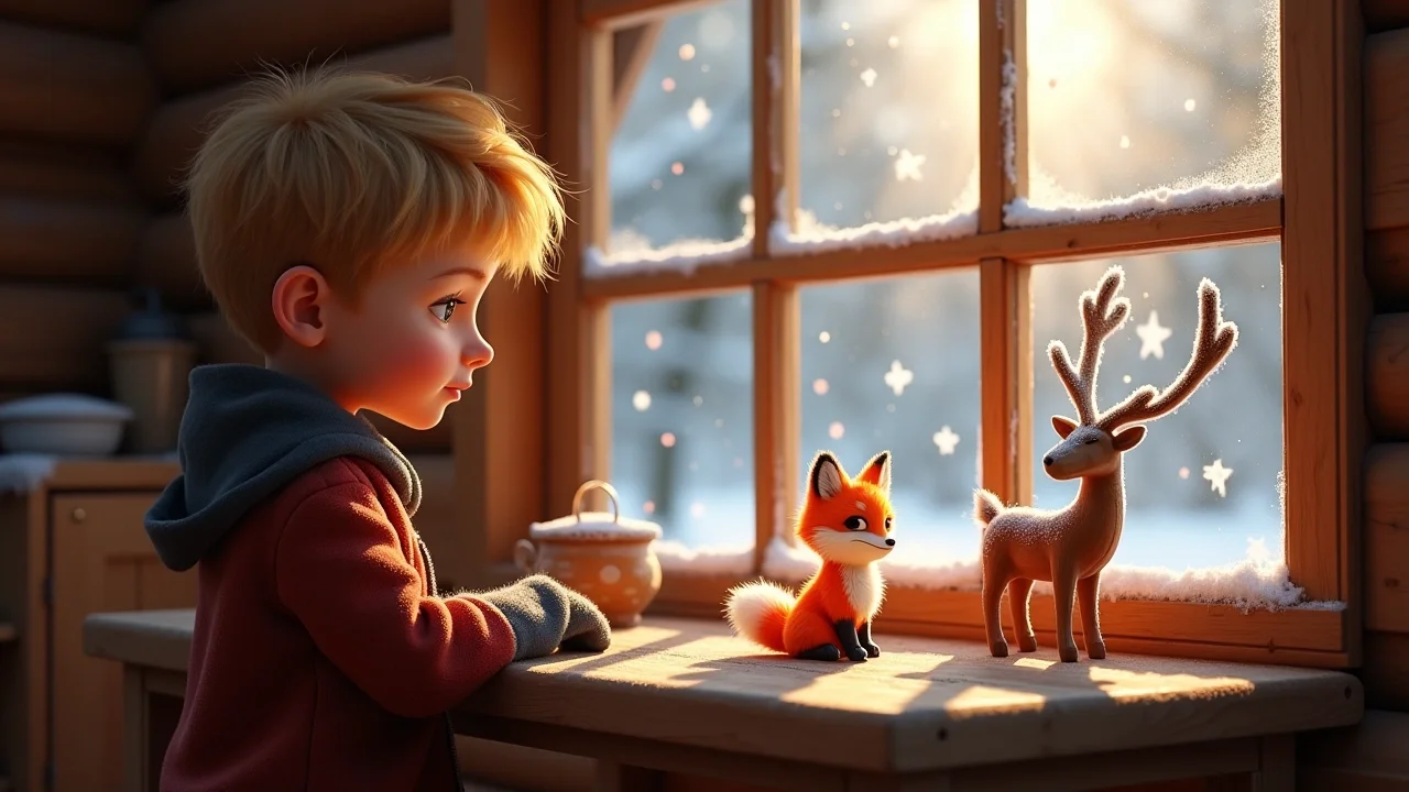 Рядом с его верным деревянным оленёнком сидело странное существо. Оно было похоже на маленькую лисичку, но шёрстка её была соткана из тончайшего январского тумана и искрящегося инея. Глаза лисички светились нежно-голубым светом, а когда она шевелила ушками, раздавался тонкий звон, похожий на столкновение сосулек.