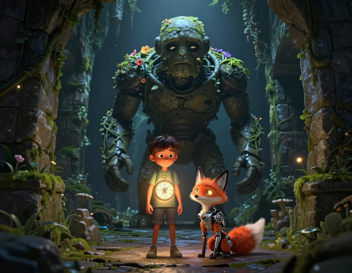 «Спарк, посмотри!» — воскликнул я, протягивая компас своему механическому другу. Спарк, с его блестящими глазами-линзами, внимательно осмотрел находку. Его хвост-антенна задвигался, издавая тихое жужжание.
