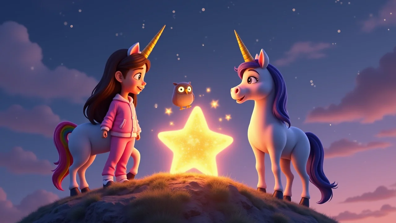Радуга и Мечта подошли к Звезде. Их рога засияли очень ярко, и от них начали исходить тонкие, золотистые лучи, которые окутали Звезду. Совушка, взлетев в воздух, начала кружиться над Звездой, и её колокольчик звенел так радостно и мелодично, что казалось, будто он поёт колыбельную. Маленькие светлячки, вдохновлённые их примером, тоже начали светиться ярче, присоединяясь к общему сиянию.