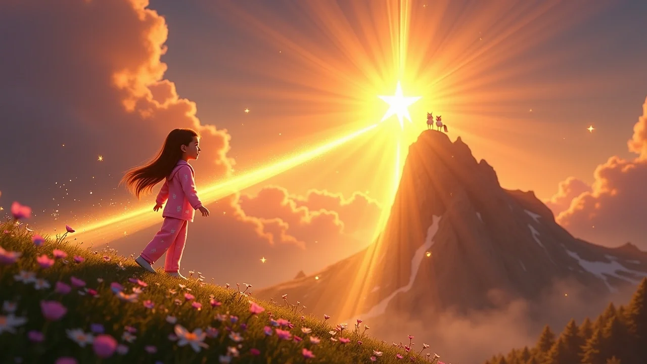 Золотая Звезда Снов сияла так ярко, что весь волшебный мир вокруг наполнился её тёплым, золотистым светом. Вероника, Радуга, Мечта и совушка стояли на вершине горы, наслаждаясь этим невероятным зрелищем. Сердце Вероники переполнялось радостью и гордостью за то, что они смогли помочь Звезде. Маленькие светлячки весело кружили вокруг, их огоньки танцевали в воздухе, а колокольчик совушки звенел особенно мелодично.