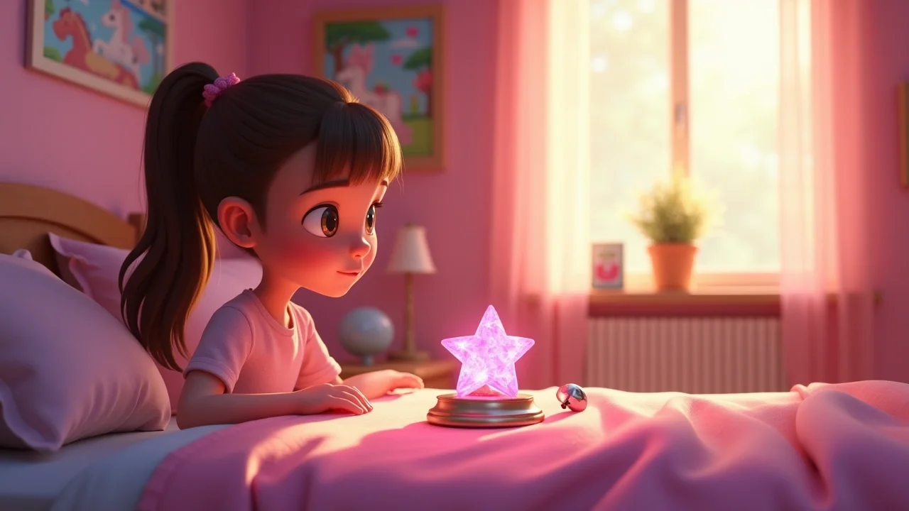 Там, рядом с лампой, лежали два удивительных предмета, которых раньше не было. Первый — это маленький розовый кристалл в форме звёздочки, который светился изнутри мягким, пульсирующим светом. А второй — крошечный серебряный колокольчик на шёлковой ленточке. Вероника осторожно коснулась колокольчика, и он издал тот самый чистый, радостный звук, который она слышала в лесу у совушки!