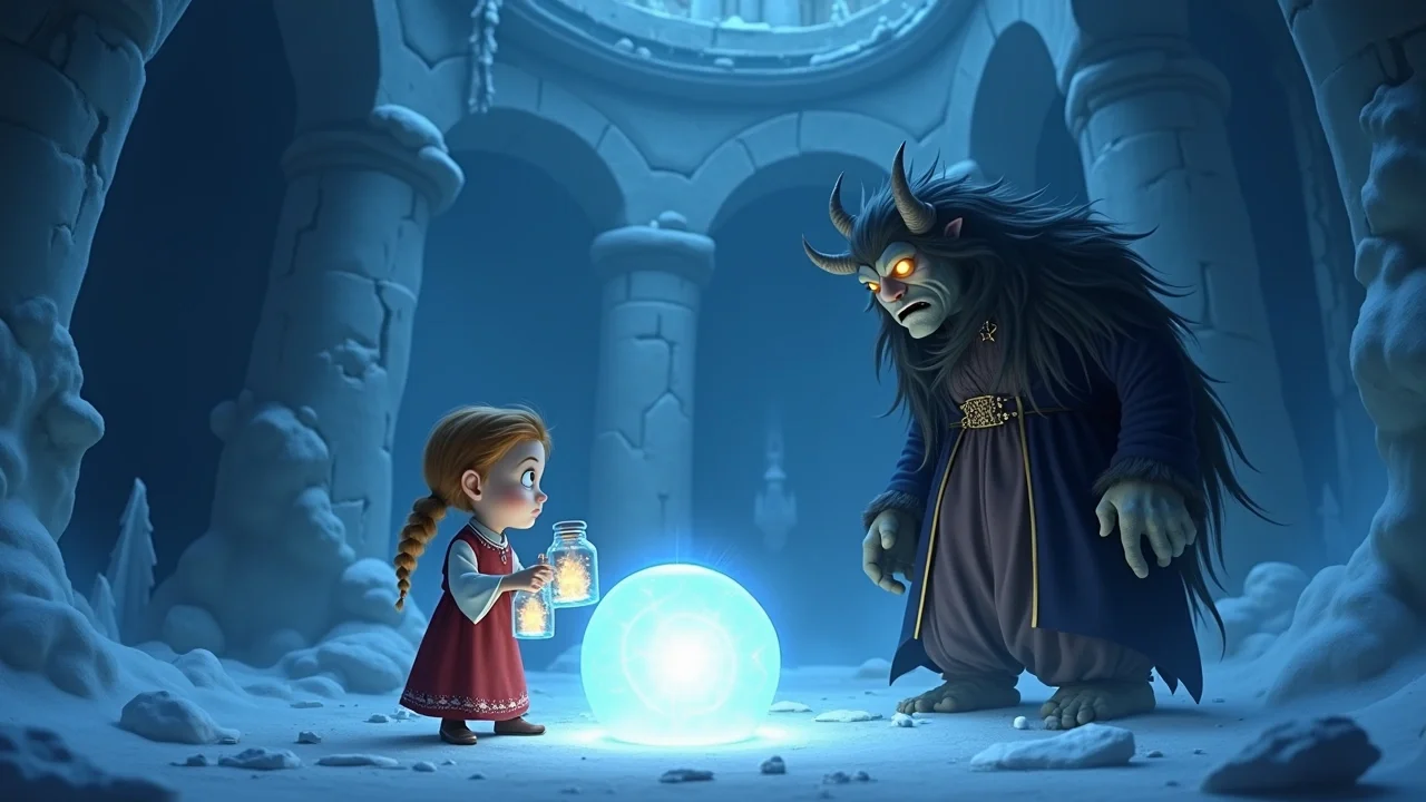 Мраковей закричал от ярости и боли. Его ледяной замок начал рушиться. Стены трескались, потолок обваливался. Колдун, пытаясь спастись, поднял свой посох, но свет от рос был слишком силён. Он окутал Мраковея, и колдун начал таять, превращаясь в лужицу тёмной, грязной воды, которая тут же испарилась, не оставив и следа. Зло было побеждено!