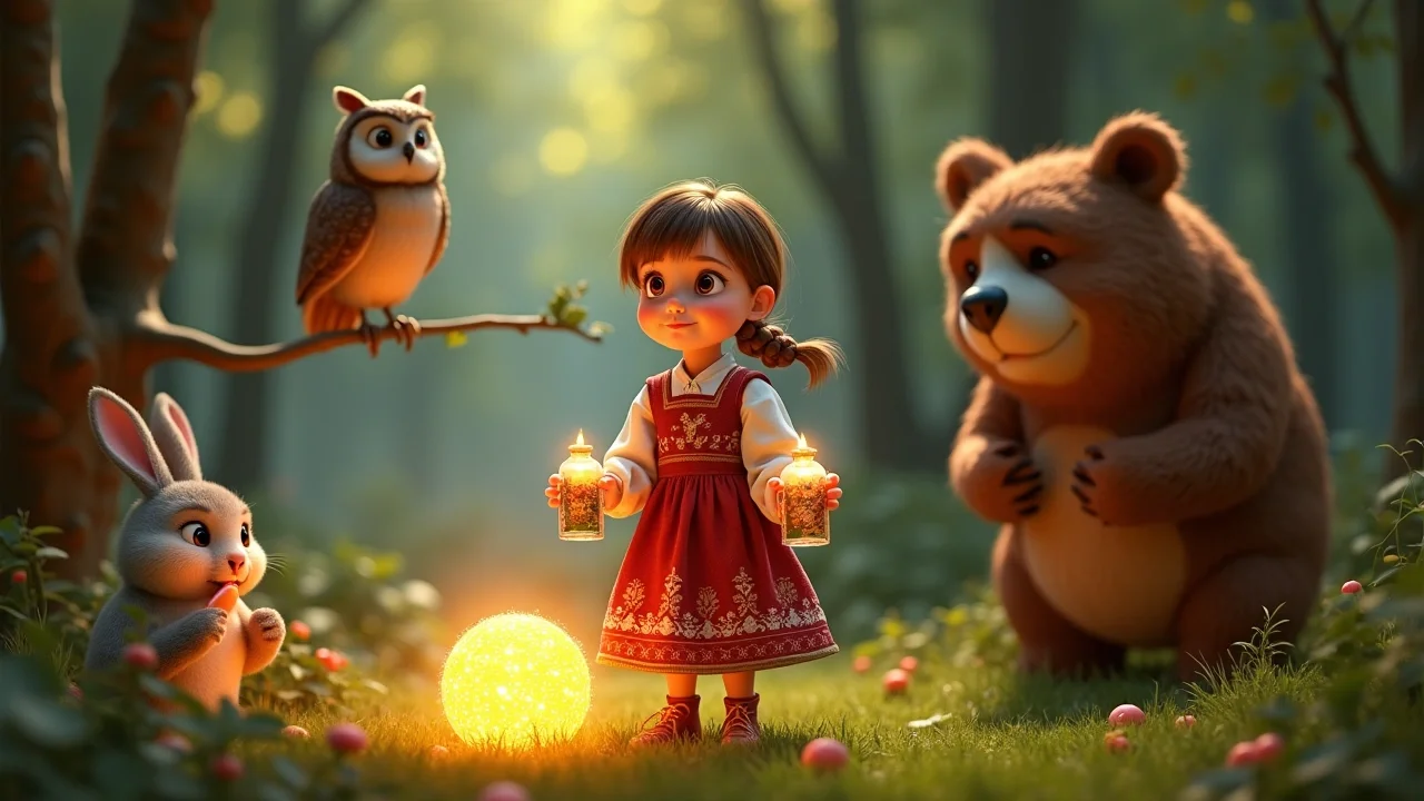 Вскоре клубочек привёл её к небольшой, но очень живописной полянке. Посреди поляны рос огромный, старый дуб, а вокруг него порхали разноцветные бабочки и жужжали пчёлы. На ветке дуба сидела большая, мудрая Сова с проницательными жёлтыми глазами. Она не спала, а внимательно наблюдала за Василисой. Рядом с дубом, на пеньке, сидел маленький, пушистый Зайчик, который грыз морковку, и большая, добродушная Медведица, которая собирала ягоды в плетёную корзину.