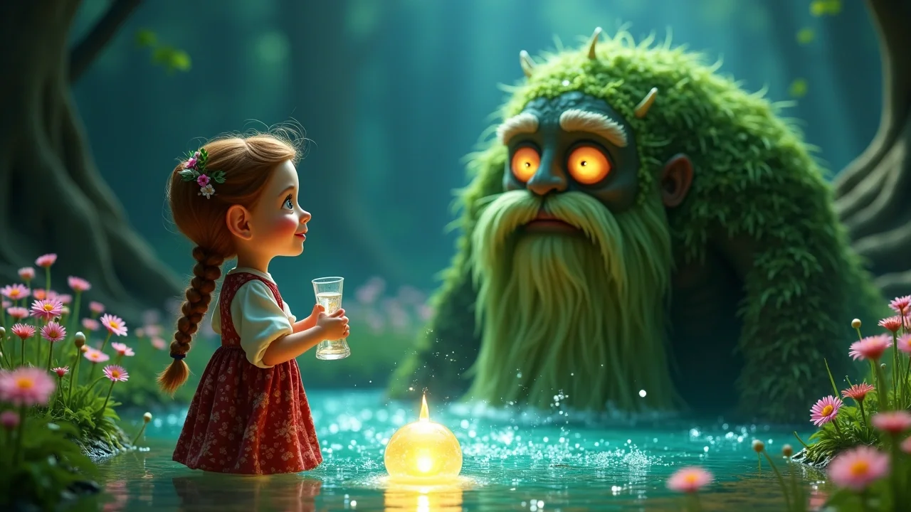 Василиса смело ответила: «Здравствуй, дедушка Водяной! Я Василиса, и ищу Росу Утренней Зари, чтобы разбудить Заколдованный Лес Дрёмы от сна Мраковея». Она показала ему Камень Чистоты, который дал ей Лесовичок.