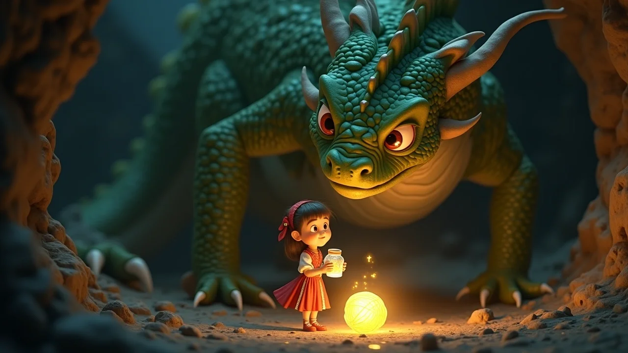 Василиса, хоть и дрожала всем телом, но не показала своего страха. Она вспомнила, что Змей Горыныч любит каверзные вопросы. «Здравствуй, Змей Горыныч! Я Василиса, и я пришла за Росой Полуденного Солнца, чтобы разбудить Заколдованный Лес Дрёмы». Она подняла кувшинчик с Росой Утренней Зари, и тот вспыхнул мягким светом.