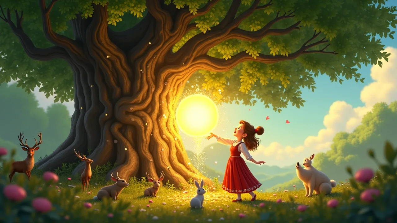 Наконец, они дошли до огромного, древнего дуба, который стоял в самом центре леса. Он был могучим, но его кора была покрыта мхом, а ветви были голыми и безжизненными. Василиса осторожно подошла к дубу и вылила сияющий шар из рос на его корни. Как только последняя капля росы коснулась земли, дуб вздрогнул. Его кора очистилась от мха, на ветвях тут же распустились молодые, зелёные листья, а из земли вокруг него забили ключи с чистой, хрустальной водой. Лес Дрёмы проснулся!