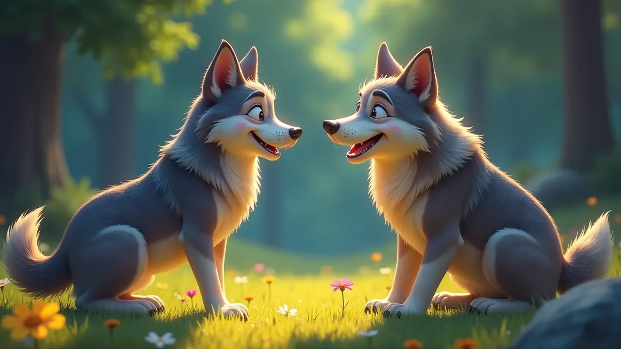 Волки, услышав такую весёлую песенку, замахали хвостами и перестали рычать. Они даже начали подвывать в такт музыке! Аня продолжала петь, и волки совсем развеселились. Они пропустили Аню и Кисточку-Непоседу в замок.